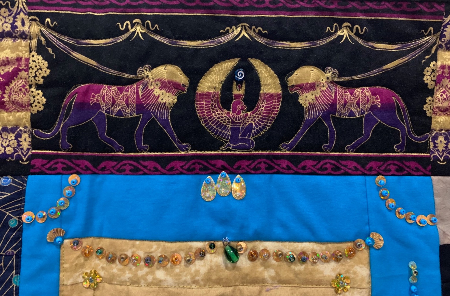 Issuing themselves a challenge, Lani Longshore and her art quilt group, the Progressive Party, wanted "to bring the emotions of Karloff's The Mummy to fabric." The Mummy, as it is so aptly named, was featured at PIQF in 2019 and stirs up all sorts of emotions. Fear at the sight of the mummy staring at you, excitement over the intriguing concept, and awe over the amazing work that this group has done in making this quilt.