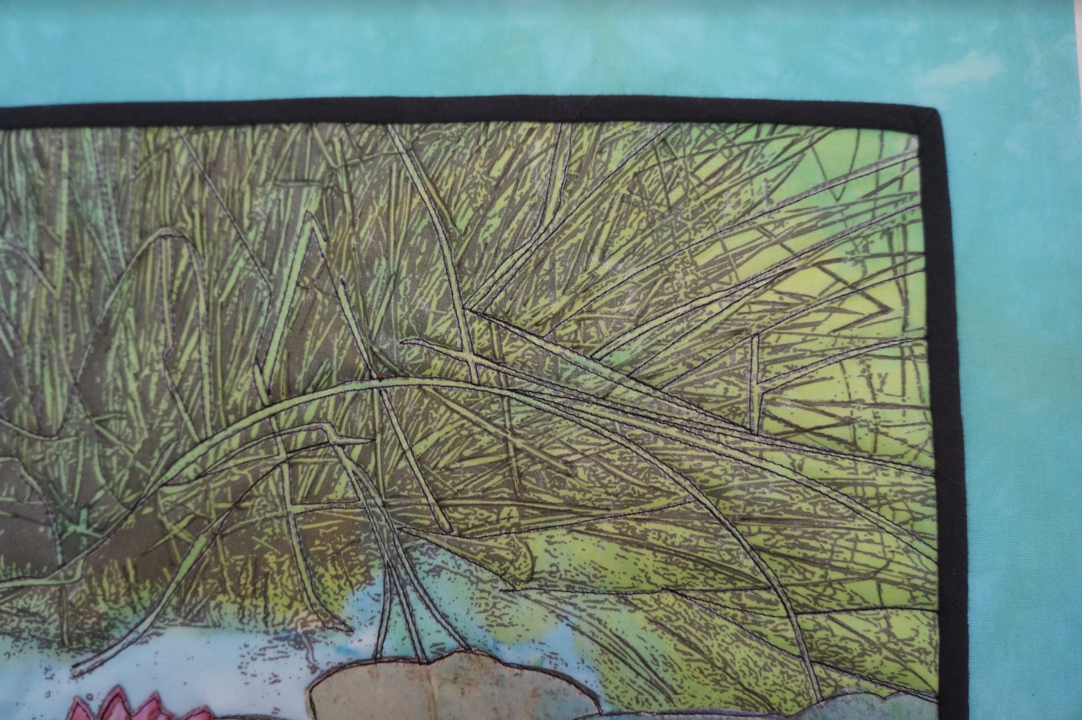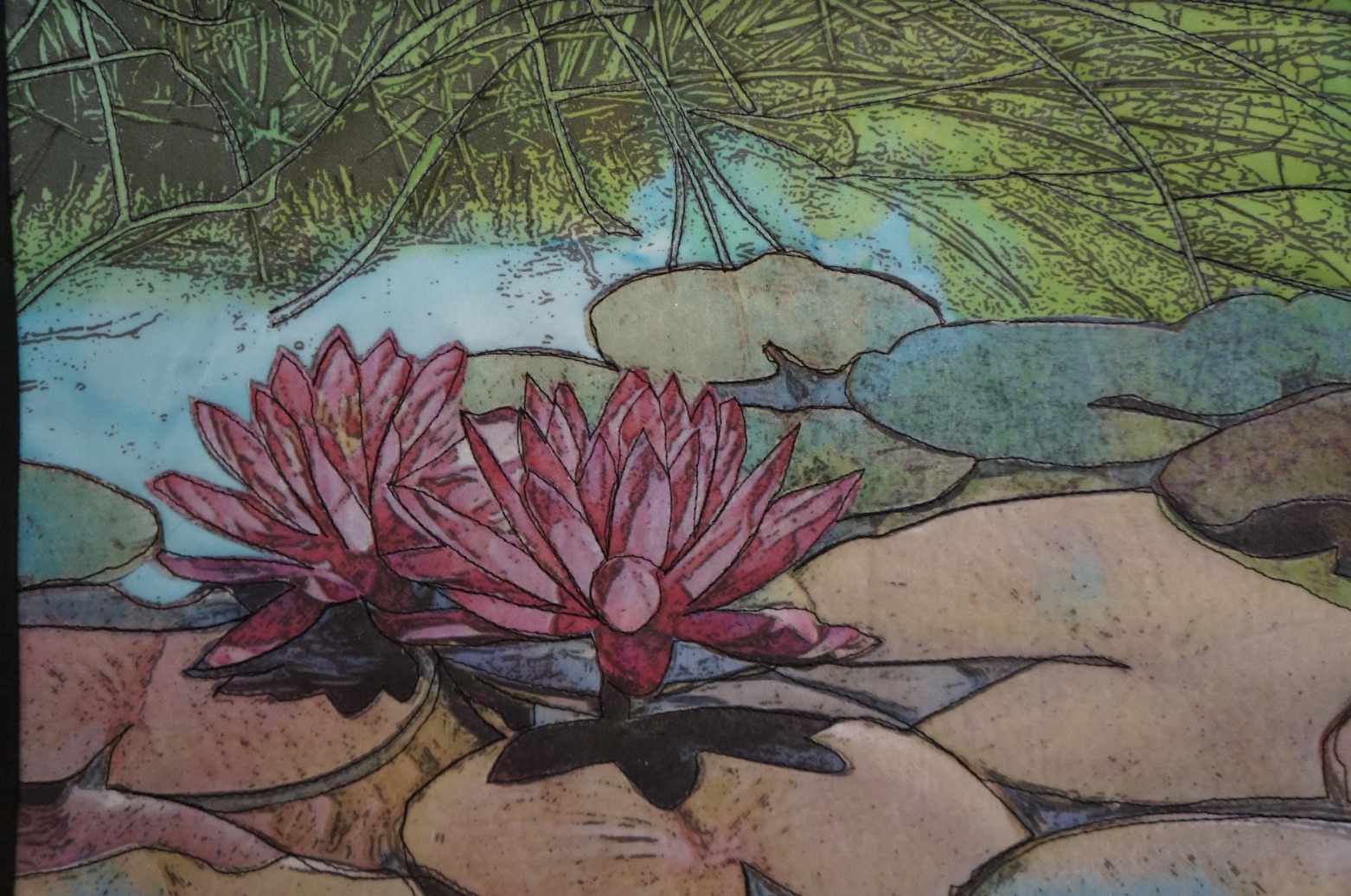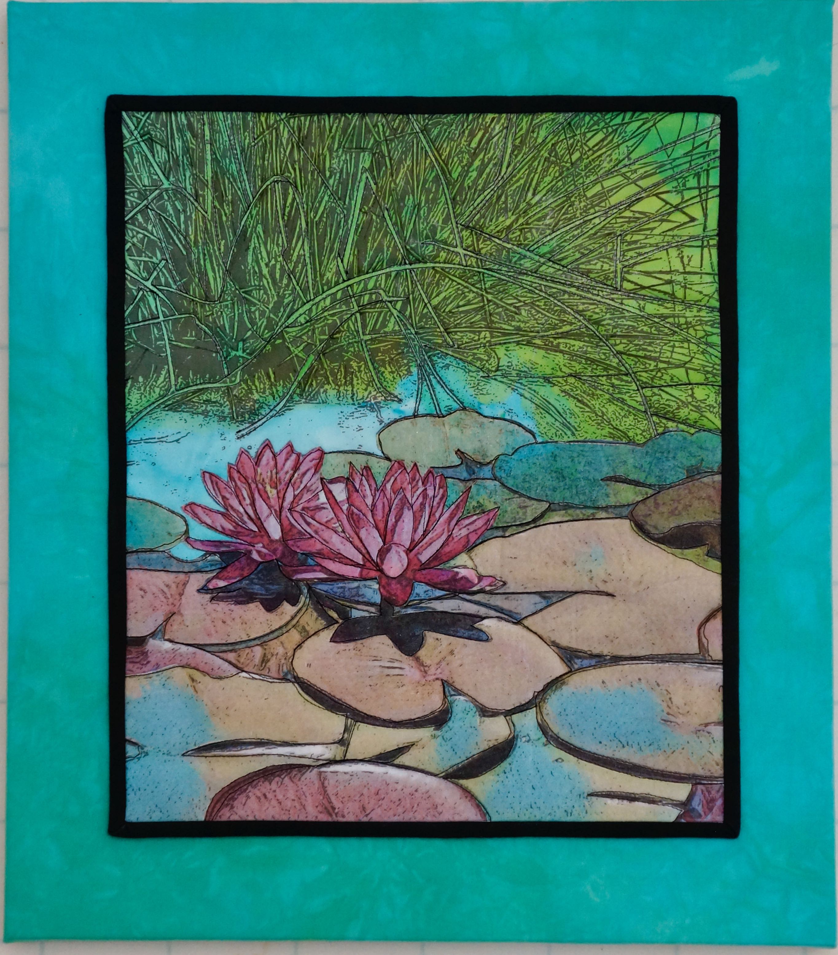 Created using TAP, or Transfer Artist Paper, Lynn Koolish's Water Lilies (14" x16") is actually three images in one. TAP is an iron-on transfer that allowed Lynn to take three different images and make one singular image, providing a matte look that printing right onto fabric wouldn't provide her. The finished result is an image that looks like it was made with water colors rather than just a couple of pictures.
