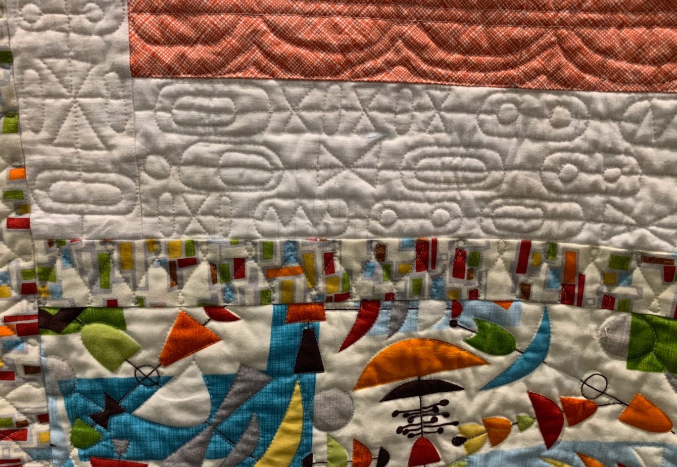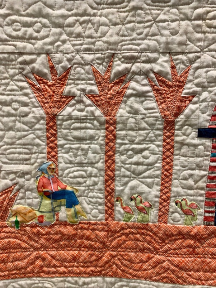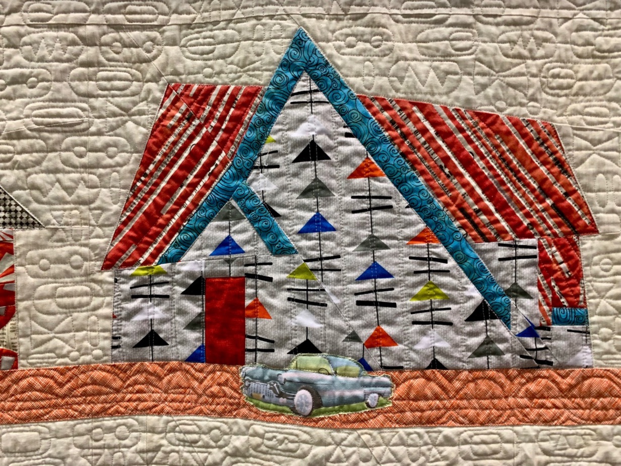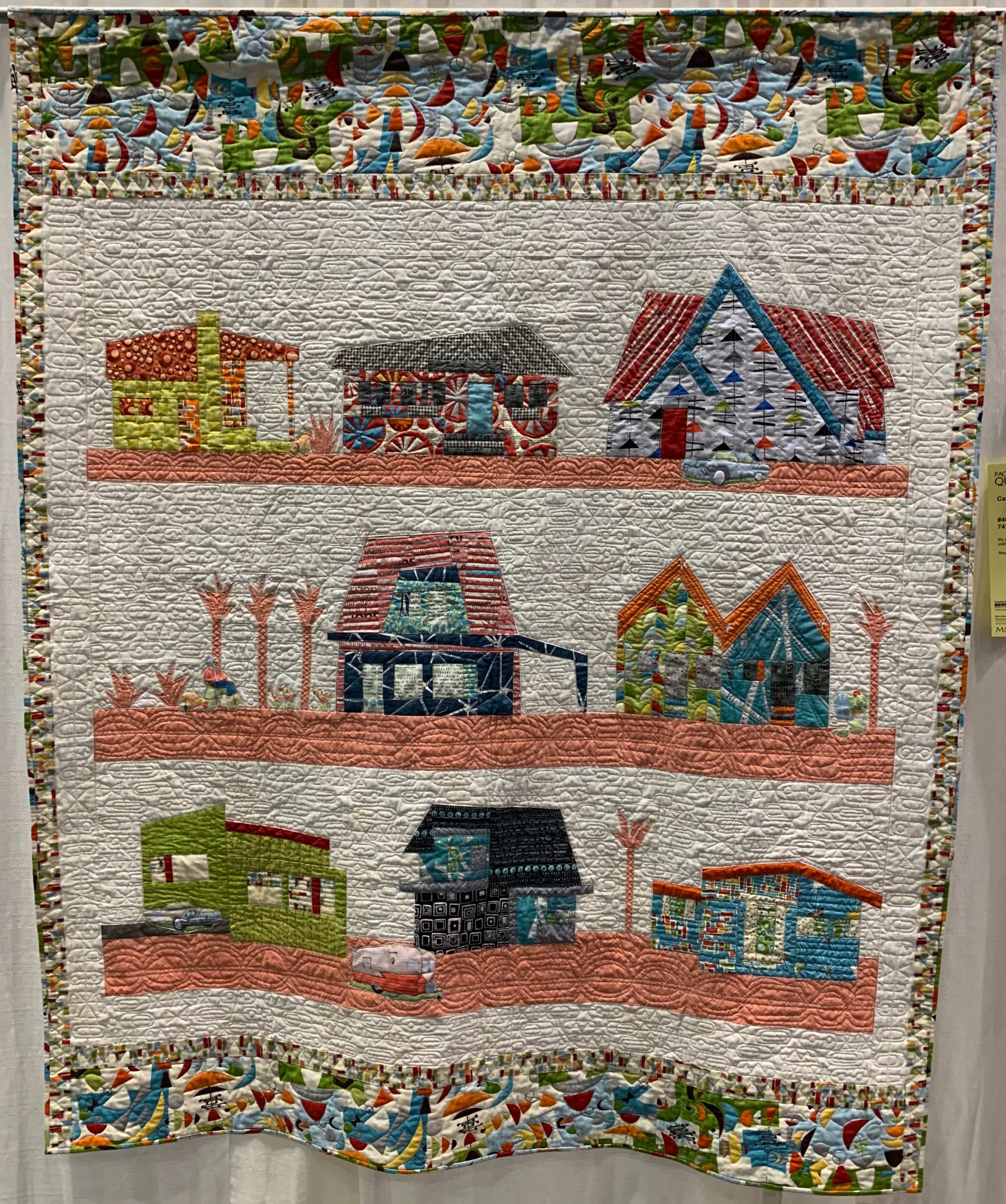 Wanting to create a "portrait of a fun 1960s neighborhood", Catherine Jarett made Flamingos In My Yard from a Carolyn Friedlander pattern with her own appliqué additions in the mix. Winning Best Longarm Machine Workmanship Modern at PIQF 2019, this yard is also covered in machine piecing and machine appliqué. Maybe they should have just stuck with lawn flamingos.