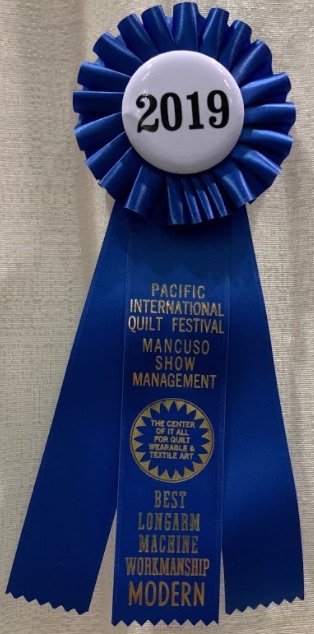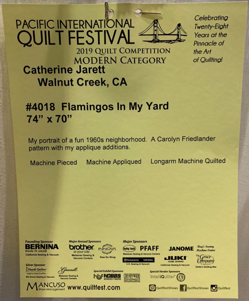 Flamingos In My Yard by Catherine Jarett of Walnut Creek, California won Best Longarm Machine Workmanship Modern at the Pacific International Quilt Festival (PIQF) 2019.
