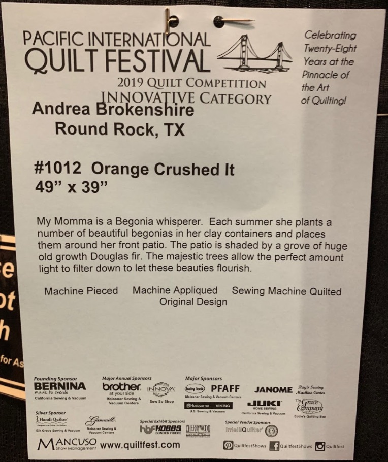 Orange Crushed It by Andrea Brokenshire of Round Rock, Texas won Best Sewing Machine Workmanship Innovative at the Pacific International Quilt Festival (PIQF) 2019.