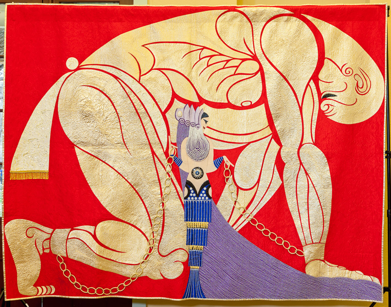 Samson and Delilah by Jerry Granata is a multiple award-winning quilt. It won an honorable mention at the MQX Quilt Festival New England 2013, 2nd Place at the NQA 2013 Show, and a 3rd Place at the Georgia Quilt Show, just to name a few of the awards.