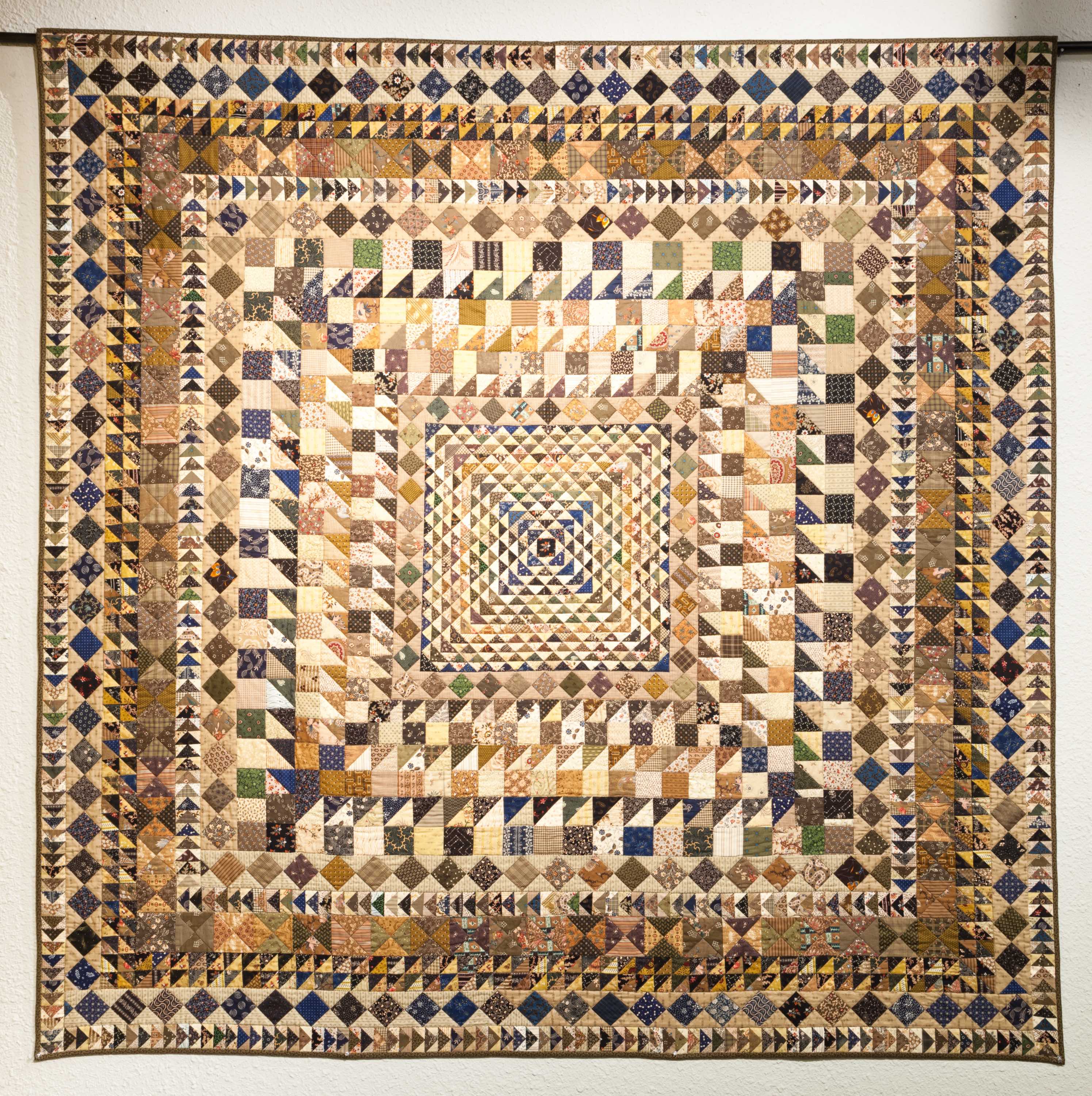 Leap of Faith was created by Mary Elizabeth Kinch and inspired by the colors she saw in a photograph containing seeds and peanuts and is in her book, Small Blocks, Stunning Quilts. Pieced by Mary Elizabeth Kinch (2007) and machine quilted by Sandra Reed.
