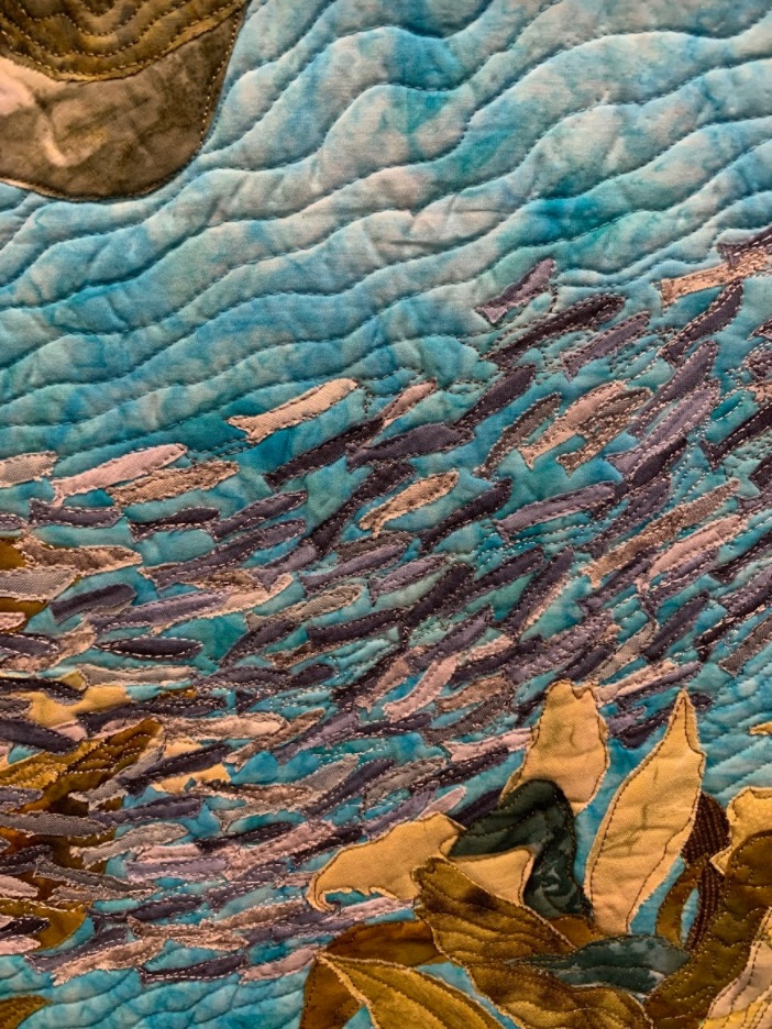 Awestruck at the Kelp Forest by Cynthia Minoli was inspired by a visit she took the Monterey Bay Aquarium in California with her granddaughter. Featured at PIQF inn 2019, Cynthia loved how "the kelp forest sways with the current, making you feel so small," like her granddaughter pictured at the bottom of the quilt. Utilizing machine appliqué and machine quilting, "the construction was completed was raw edge appliqué and free motion quilting."
