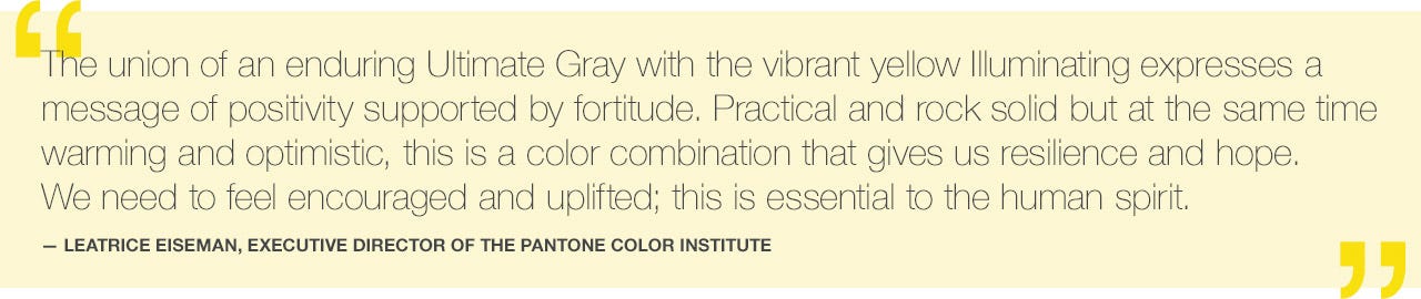 A message of happiness supported by fortitude, the combination of PANTONE 17-5104 Ultimate Gray + PANTONE 13-0647 Illuminating is aspirational and gives us hope. We need to feel that everything is going to get brighter – this is essential to the human spirit.