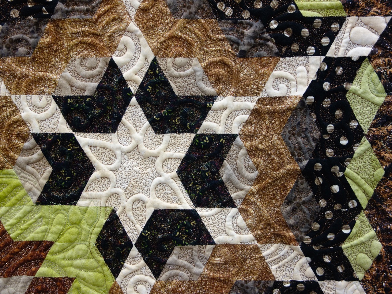 In a symmetrical design, I think it’s important to add details that are not symmetrical. This is called near symmetry. (A design that is exactly the same on each side is called perfect symmetry.) In Uplifting, the yellow flowers are placed irregularly. There is also a swarm of green hand embroidered x’s that sweep from the bottom left to the top right. Even the blue arch dips down over the yellow on the right, but not on the left. These small asymmetrical details add interest and dynamic movement to the design. They keep a symmetrical design from being static or boring.