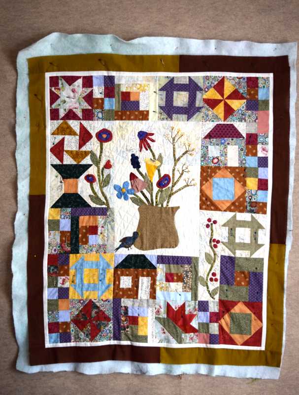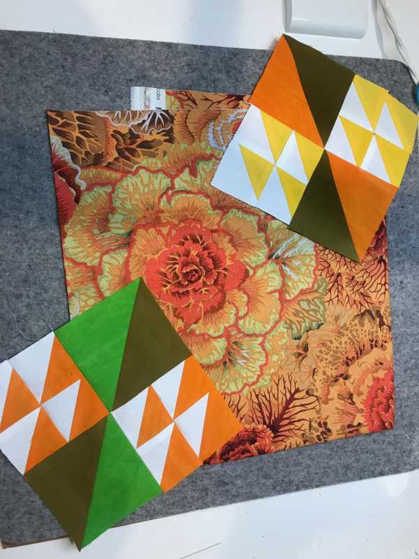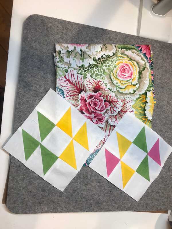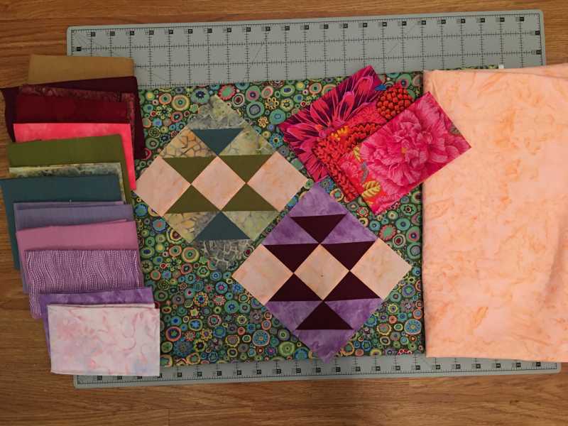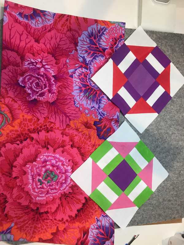 I have just started the Kaffe Mystery Quilt and have been quilting about 2 years. Decided to do this to practice, practice, practice my block skills as I have been delving into art quilts. I love to do thread painting portraits. Anyway, here are my three block thus far using the Brassica fabric as my color choice inspiration.