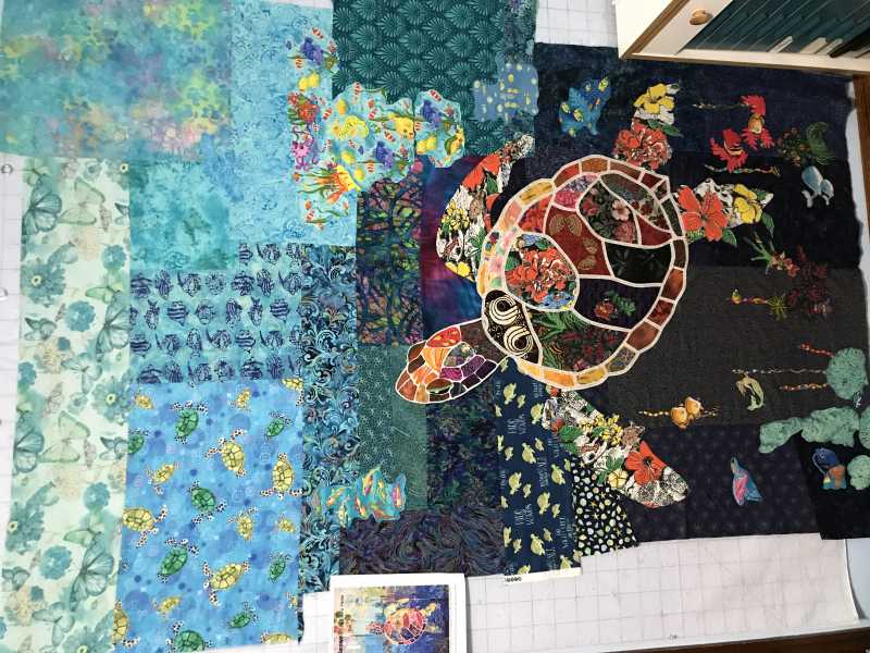 Working on the back of a quilt for my husband. The front is a large turtle, the back is a combo of blocks that are made from several of our grandkids. Took me a long time to figure out what to do with them.