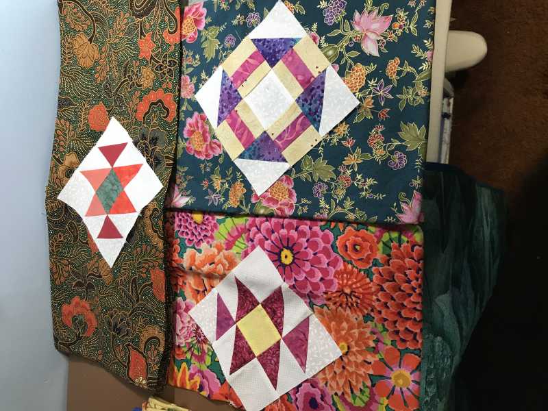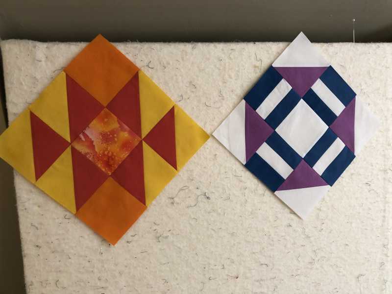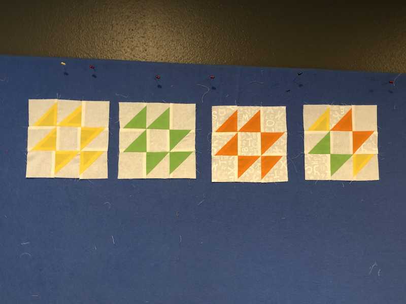 I LOVE everyone's blocks so far. Barbara, thank you, thank you, thank you for the tips. For blocks 1 b, c & d I trimmed the HST with a bloc loc tool, changed my thread to 80 wt and measured after each square addition. It took a little longer at the outset, but all three measured 6 1/2" in the end and I didn't have to spend the time blocking them to get them to measure up which took more time on the back end and the results weren't as pleasing. Here is block 1. Now to cutting out block 2. I think I will use a combo of sizes and see where that takes me.