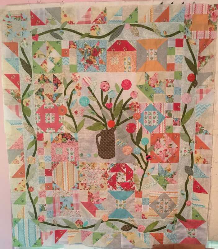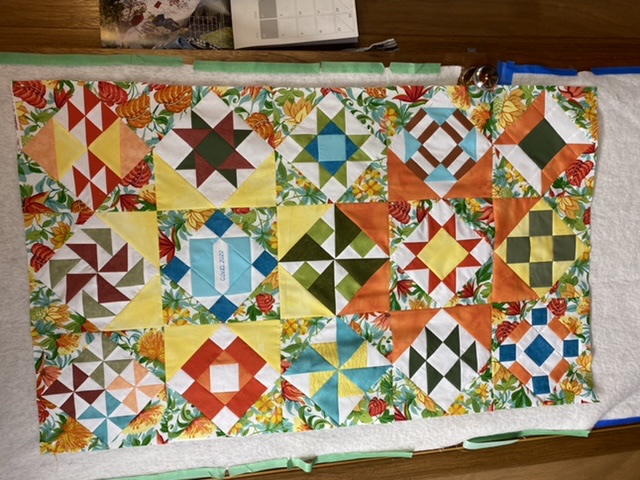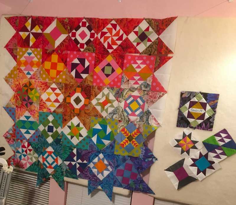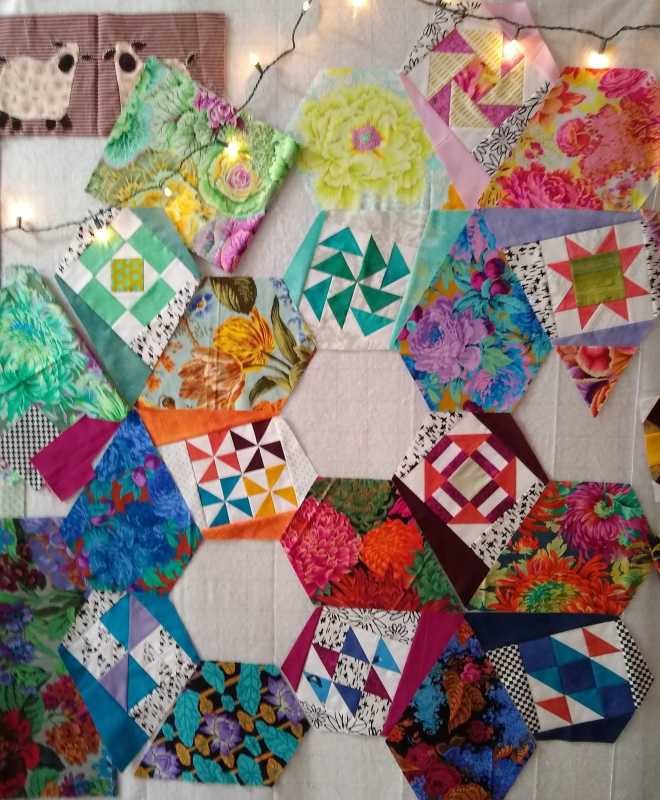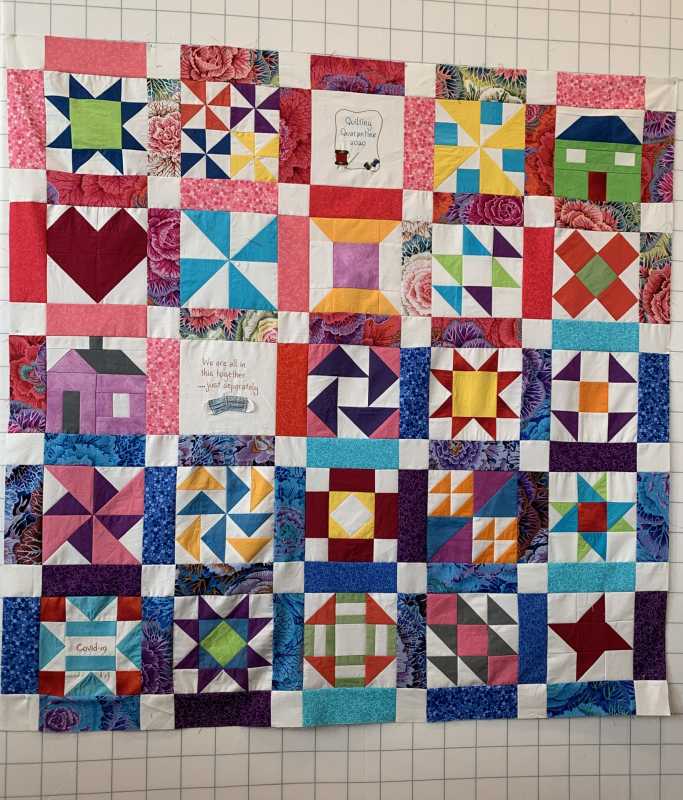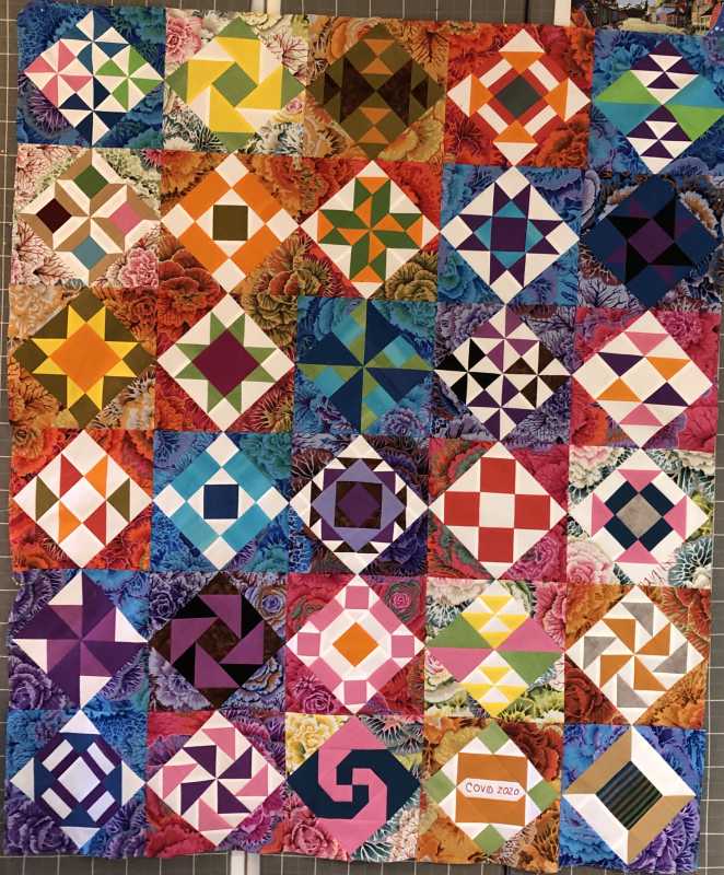 This quilt has really challenged me. Some of the Kaffe fabric bundle was way outside of my wheelhouse. However, I kept on making the blocks, learning the color wheel, and stepping way outside of my comfort zone. Alex, you have taught me so much during this process, from pinning, to glueing, to color choices and finally for taking a chance. I knew that this quilt had to be a way for me to express how this pandemic has impacted our lives. I have 2 houses in the quilt. One represents my house, the other, my family and friends who I have seen for a limited time from a far. The blue and green house I had to design and figure out the size of fabric needed for each section. Thank you once again Alex for showing us how to use graph paper to design a block. One block says “we are all in this together....just separately. It has a little mask on it representing the 500+ masks that I made for hospitals, small businesses, and family and friends. And of course I had to put a Quilting Quarantine 2020 block in there The signature block, COVID-19, I did my way. I turned the flying geese to make a star and made the signature portion to read straight rather than on a slant. Now I just need to figure out how I want to quilt it. Thank you Alex! I hope one of the pictures adds properly.