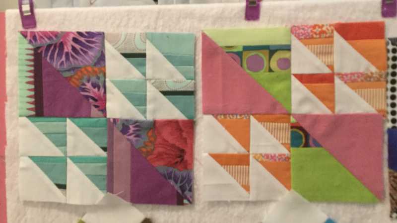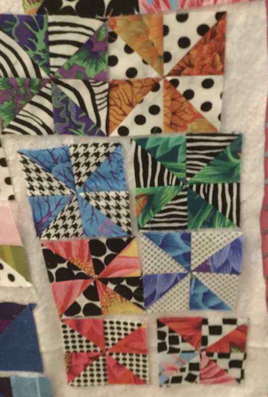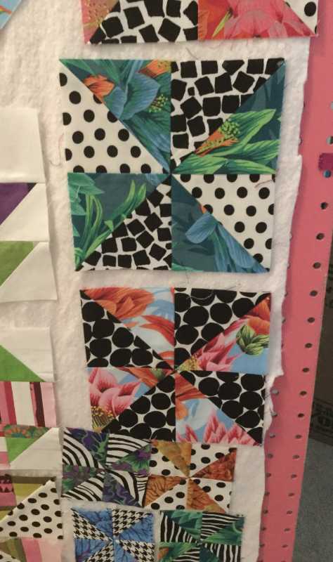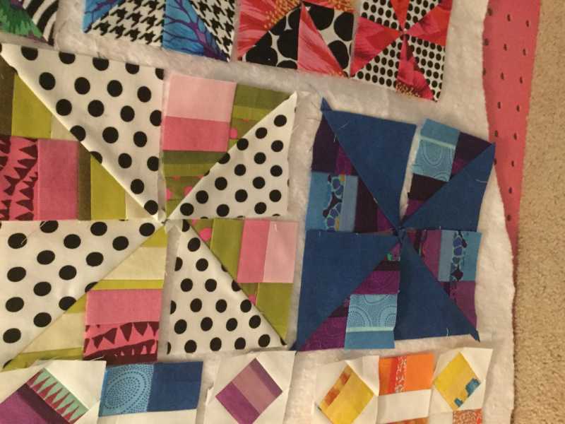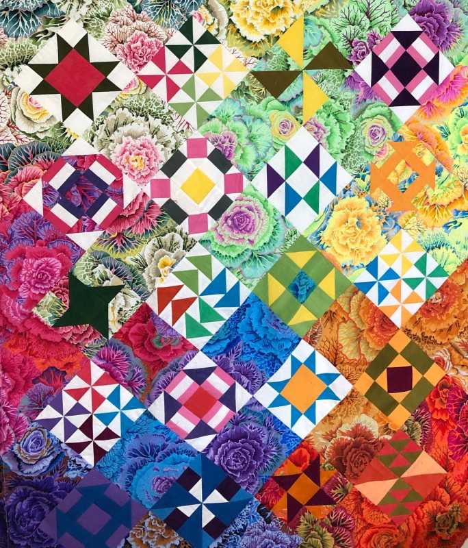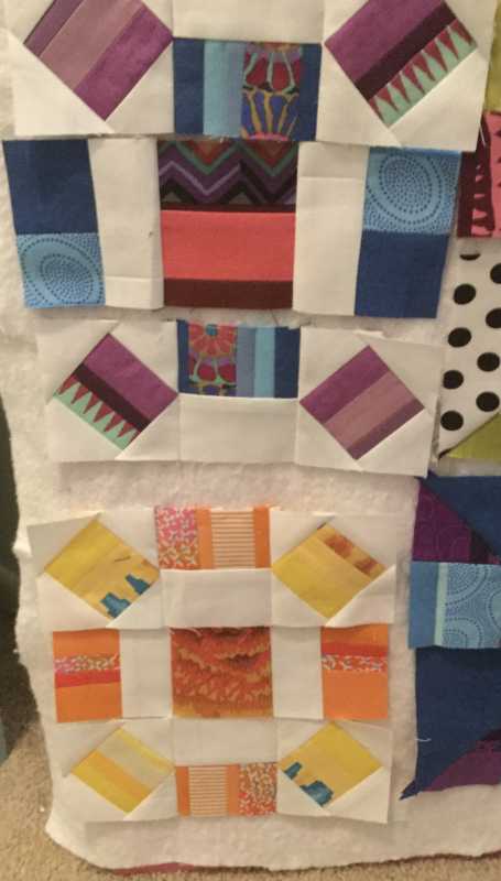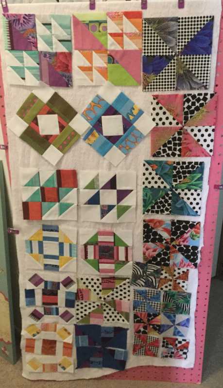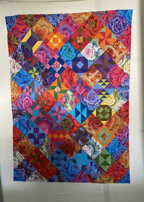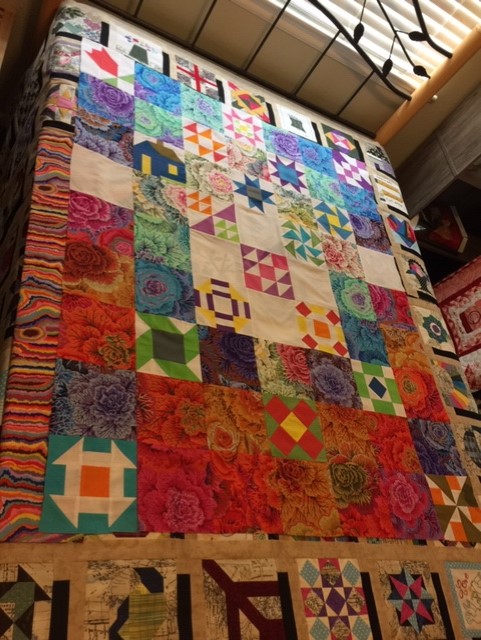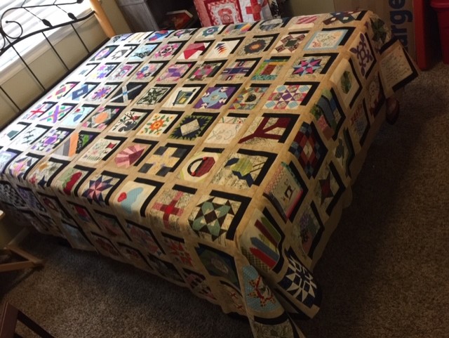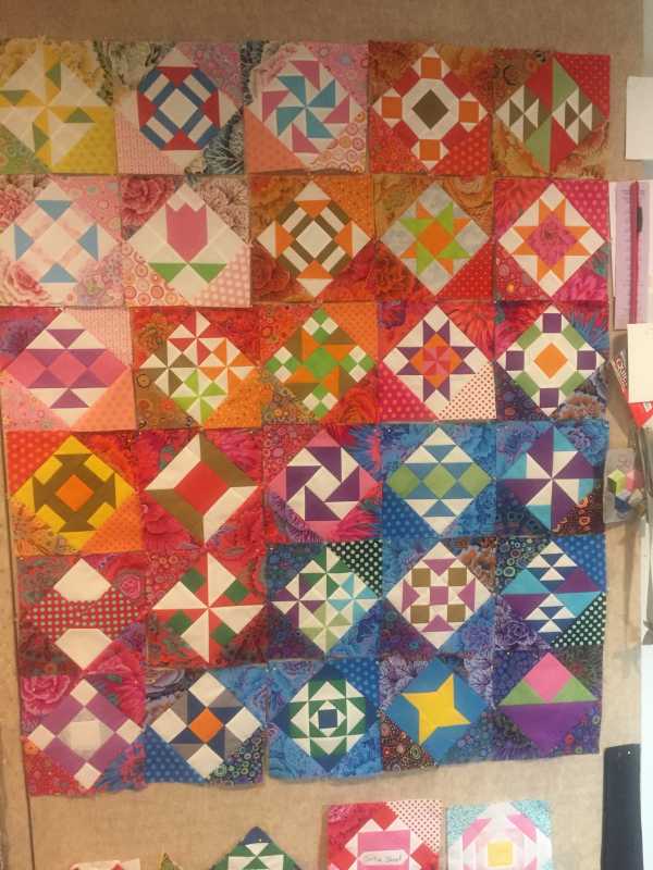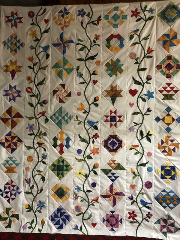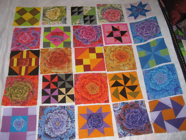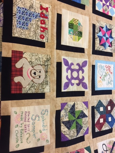 OK, so I have liked the Kaffe fabric- but never purchased any before now... never knew how I would use it. So this really moved me out of my comfort zone. It was a great journey and I thoroughly enjoyed it. So here's my top, auditioning a stipe as a border - thinking maybe 3 inch border? I plan to do a bit of embroidery and applique on the white blocks, thinking perhaps vines and leaves? Since it was laying on top of another project I've been working on finishing up from another site (Pat Sloan and friends Splendid Sampler - the first one.) There are 121 blocks including a few I added to personalize it for my life: We live in Idaho, We added a puppy in January to our family, and I had to put a label somewhere. Thought you might like to see that as well.