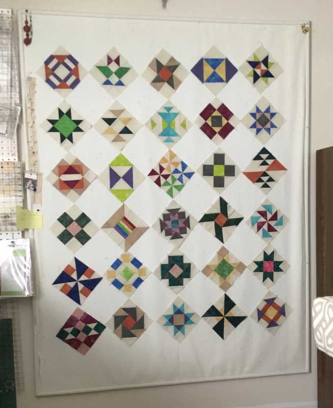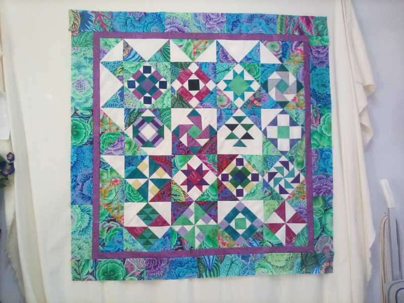 I have enjoyed watching Alex Live since the start. I have learned so much and I believe I have improved my piecing skills exponentially. My daughter helped me choose a setting for a small quilt with four nine-patch blocks. Each nine block group has a Kaffe Fussy Cut flower with eight blocks of like color solid/Kafffe pieced blocks. I hope to complete sewing the third and forth sections today. As I made it small, I am already planning another quilt with the "leftovers".
