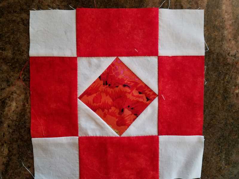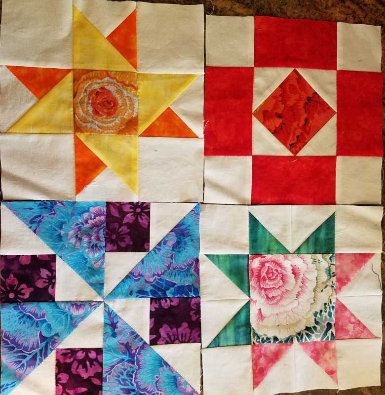 I have only done 4 blocks so far because my sewing room was invaded by a mosquito (I am allergic to mosquito bites, yikes. lol) and so I sewed these 4 by hand instead of machine.