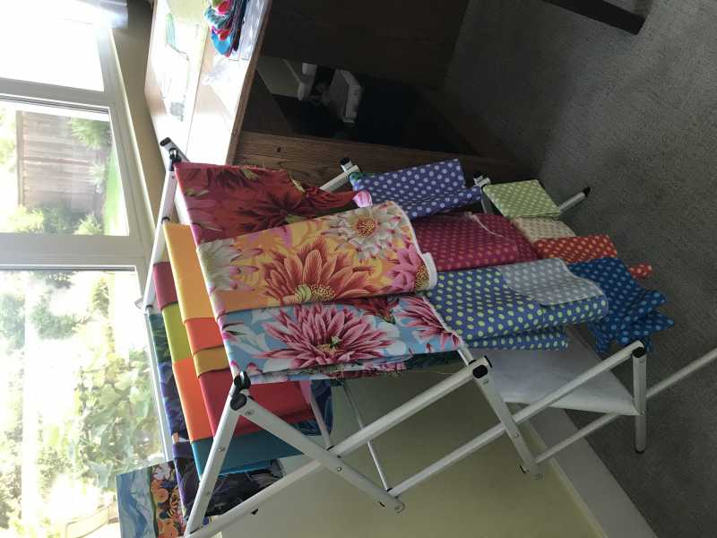1. I got one of those small clothes dryer racks and hung my fabric next to my cutting table, so much easier to look at colors and find what I was looking for! No piles of mess all over.
