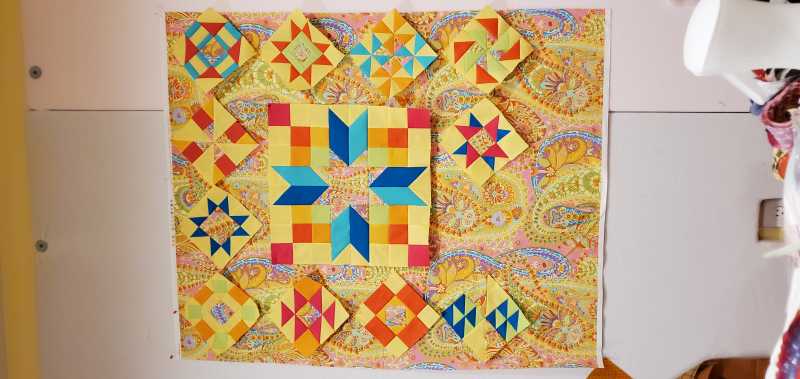 I have a design wall very similar to this idea., but it uses a roller shade with a really nice 'fabric' type flannel /vinyl (I'm guessing, but the blocks stick to it better than my other design walls which are just flannel. I can't sew without several design walls. ) Anyway, a roller shade would be even easier to 'put away', just roll up. One could just glue a flannel to the surface.