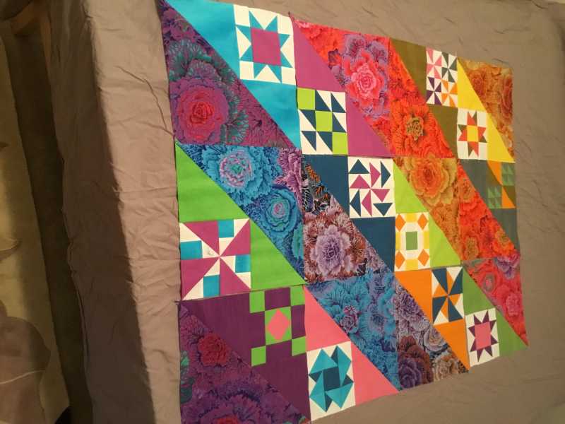 This has been so much fun. It just needs a border. Thinking of doing like Alex with 1/2 square triangles.Suggestions appreciated!