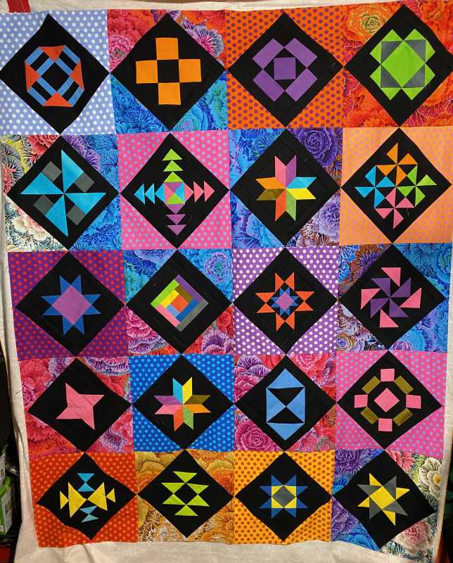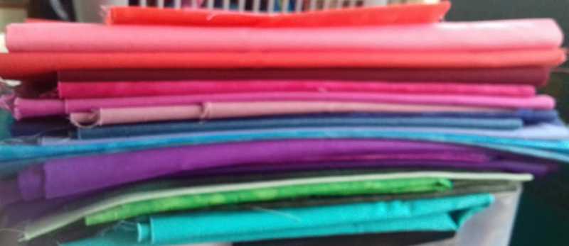 I was concerned about the size of the squares at first due to having arthritis in both hands, but once I got started there was no stopping me. I was way way behind everybody as I didn't have the Kaffe fabrics, so raided my stash and pulled out some batiks and plains and off I went