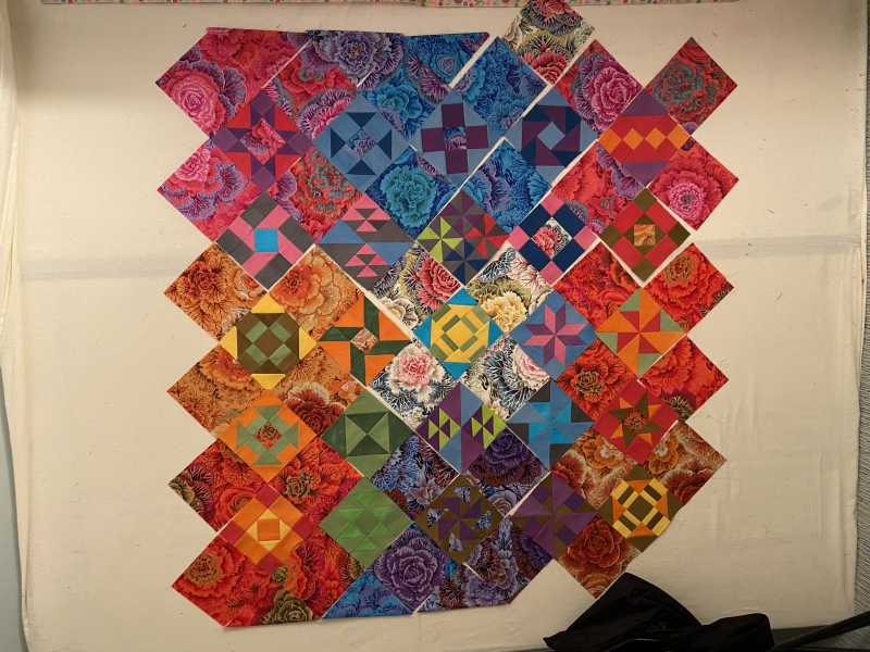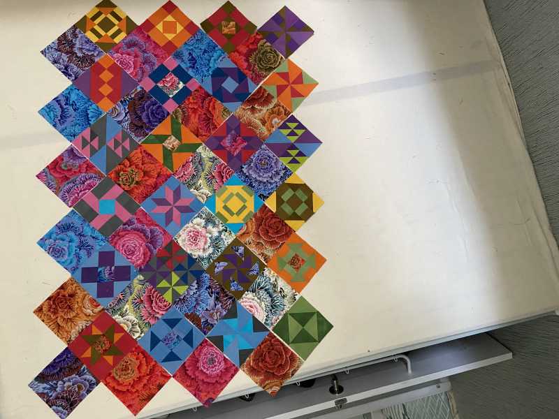 My blocks so far, I decided on a strippy quilt but want to try it on the diagonal too! More blocks to make anyway. Just had a horrendous storm so staying downstairs for now.