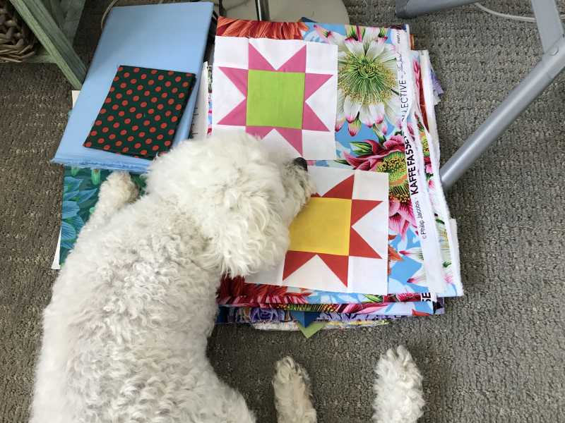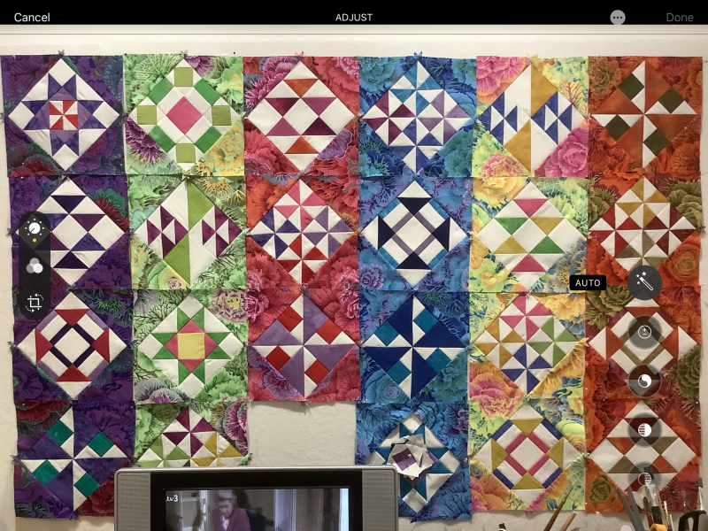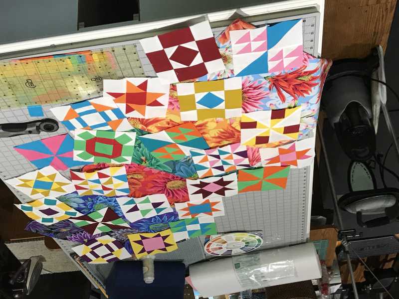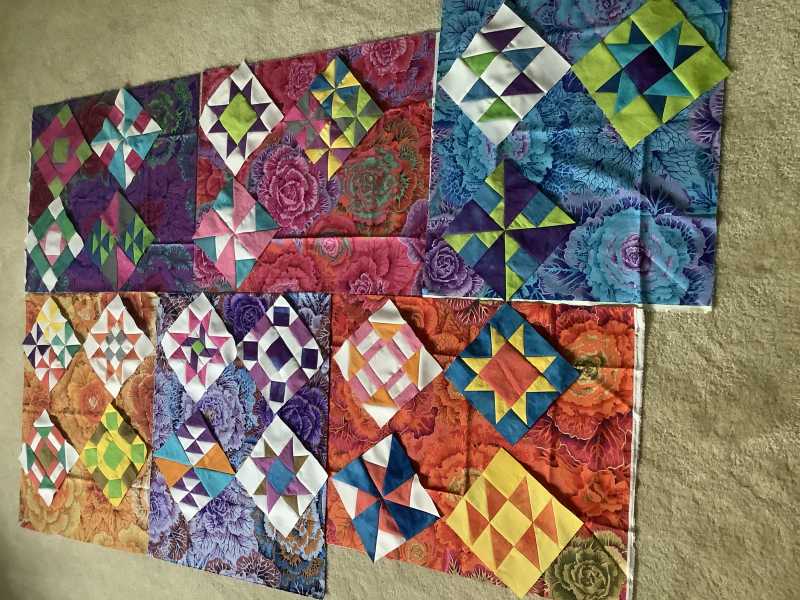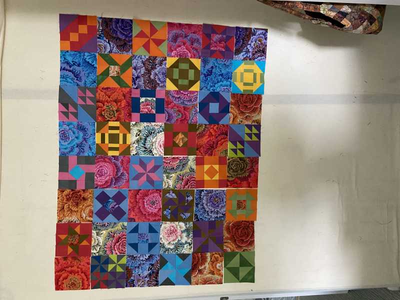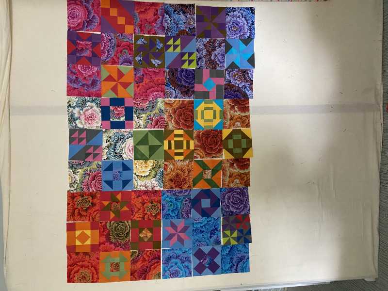 I always line up by color according to color wheel (YORPBG) with tertiaries and pastels (pink, lavender, aqua) in between before mixing them in the quilt. My next step is to mix the blocks with the Kaffe print corners.). THEN stand back and look through your camera lens. Which color jumps out to you?