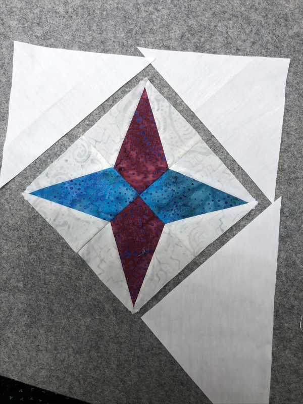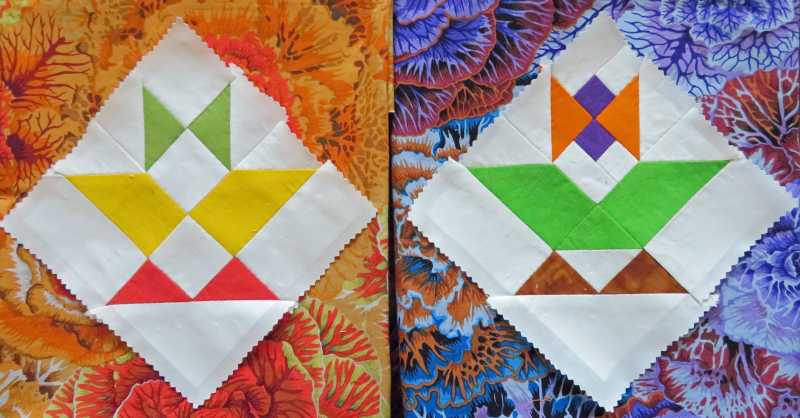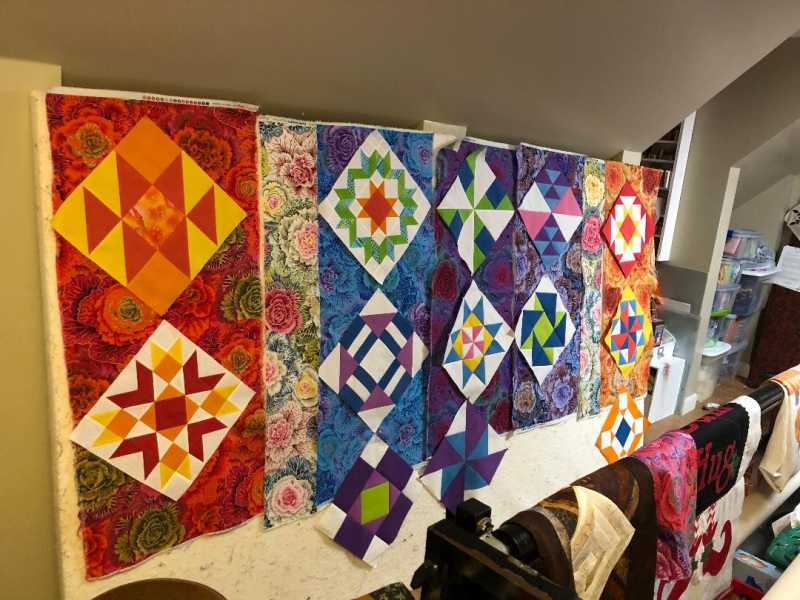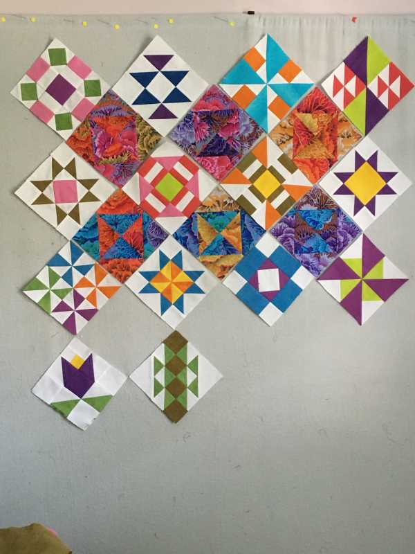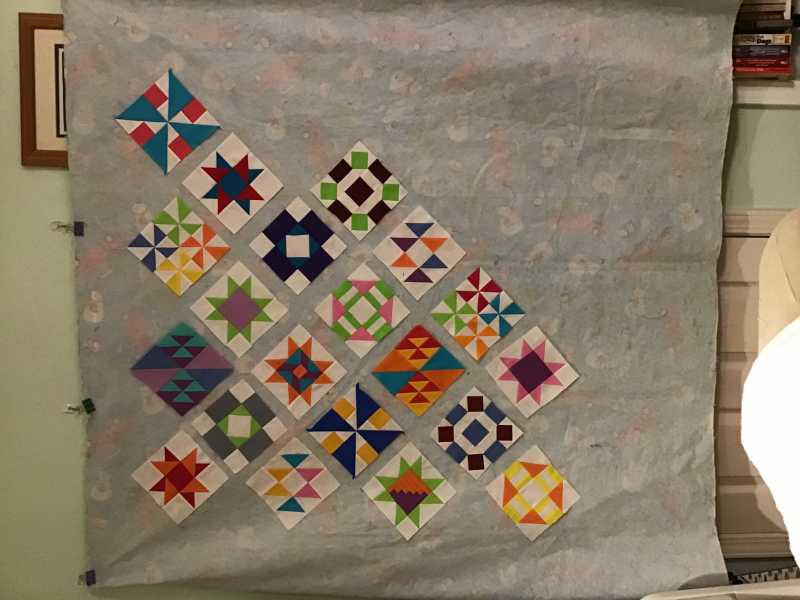 I'm playing around. I'm going to try switching the orange/red to the middle and the blue/purple to the outside. I also have been thinking about replacing the light brassica with a white border, with nine blocks in the center, and blocks in the border beyond the white border. More block to make though!