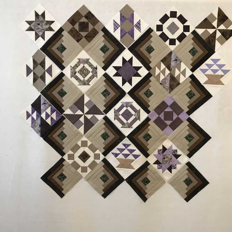 Several of you have commented on my color scheme. There's a story behind it - I'm not fond of purple. About 15-16 years ago, I was in a quilt shop while on vacation. I wanted a souvenir, but didn't have space for a bunch of yardage, so was browsing the fat quarters. I saw a purple print next to a taupe one, and liked them together. I decided on the spot that I needed to explore this color combination, to learn more about using shades of purple. And that purple fat quarter has sat in my stash ever since. I've added a few purples over the years for applique projects, but I still have very little. Hence this project - I am finally addressing "my ignorance of the use of purple"