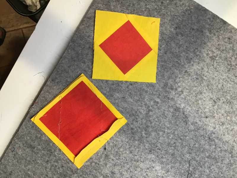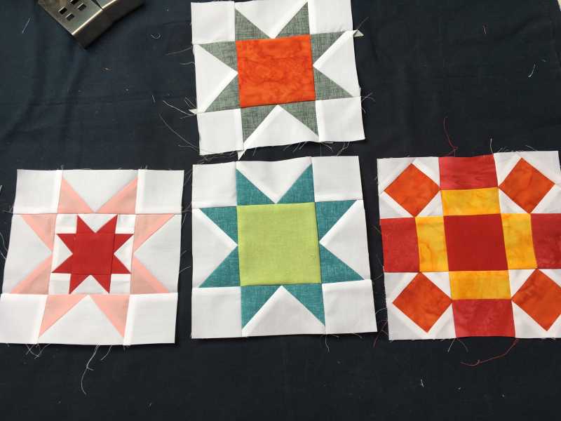 I really had a hard time doing the paper piecing for the star block. After a horrific mistake and then reviewing Alex’s lesson five times I finally got it, Here is the horrible mistake, the corrected center and my first star.