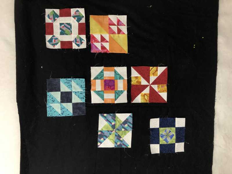 With encouragement to proceed with black fabric instead of white, here is what I have so far. I sewed and ripped and sewed and ripped "Flock" about 4 times until I was happy with the joining, but then didn't like the color combo, so haven't gone back to that block yet. I always have a plan for EVERYTHING, so enjoying the challenge/joy