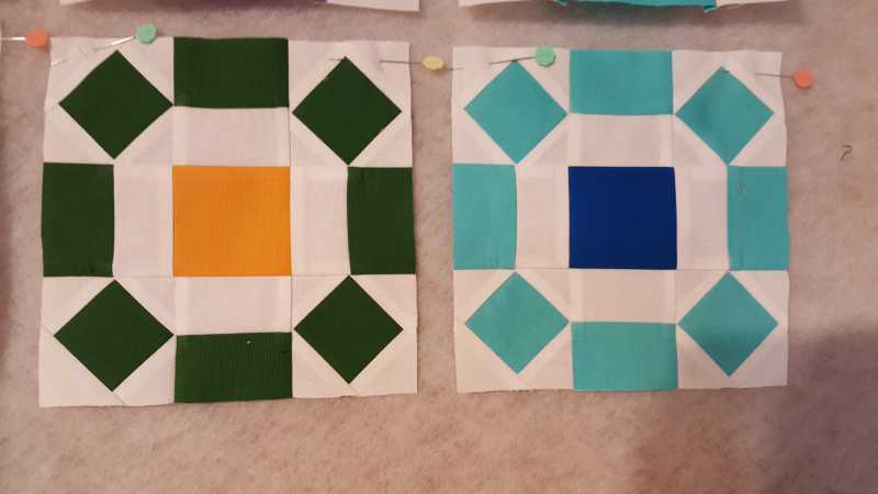 I am having so much fun with this project. Here are the two Single Wedding Ring blocks I made. I cut the square in a square centre at two inches which is too big so I had to start my first block over as it wouldn't go together. I used my least favourite colour in one of these blocks. Can you guess what it is?