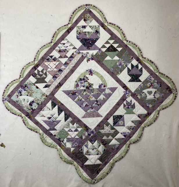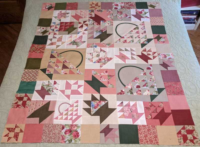 I have been on this covid-19 journey starting with the Sequoia quilt, then the Kaffe quilt, and now the Basket Puzzle quilt. With each class, I have learned much and improved on my cutting, piecing, and pressing, to the point my Basket quilt went together like a dream. I decided to put in an inner border using the red gingham I used on my basket handles. I will also use the gingham for my binding. Thank you, Alex, for all the lessons, tips, and tricks you taught in each class. My favorite tip was using the Quilter's Select glue stick to glue the fabric before piecing. The best advice was simply to slow down in my piecing.