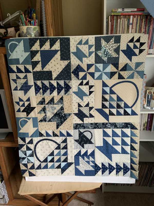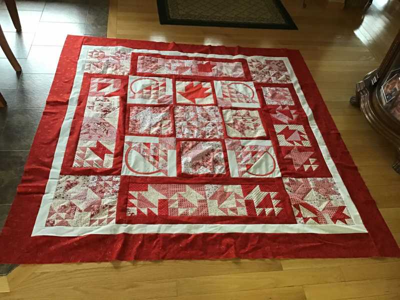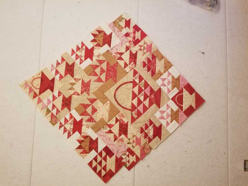 A bit more work to do filling in empty spots. I now realize I have painted myself into a corner: Given the way I have oriented the quilt, I guess I must come up with a design for the 4 large triangles triangles that will be needed.