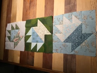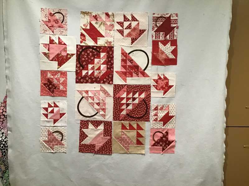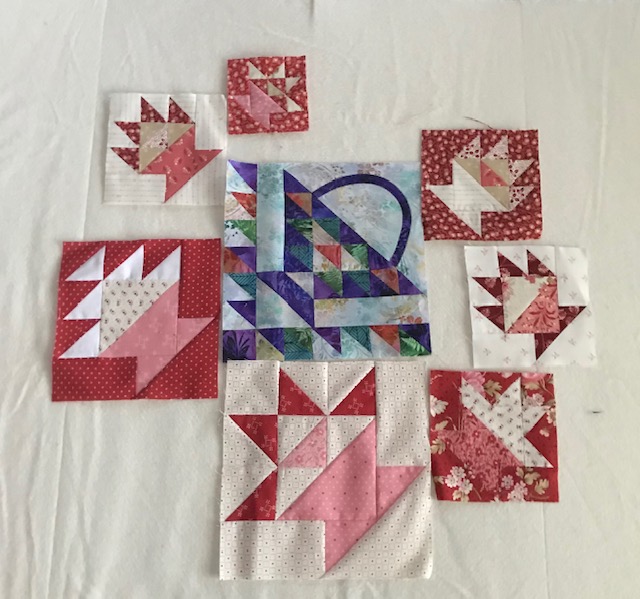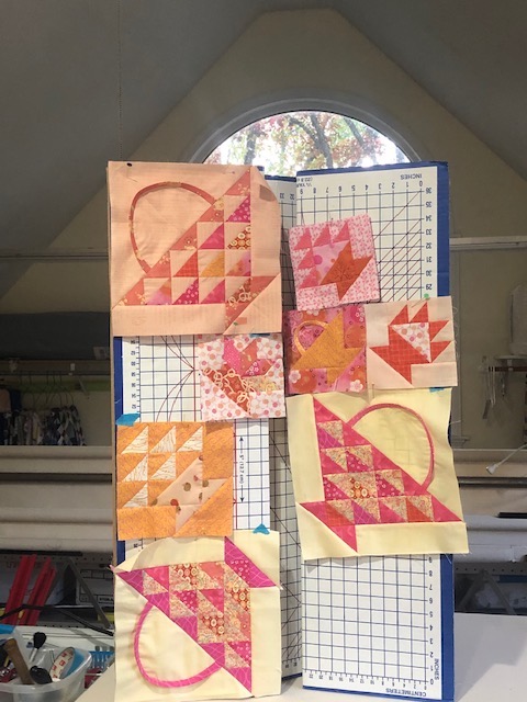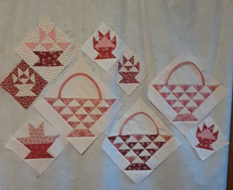 This is what I have done thus far. Will keep this quilt small as I want to teach myself how to do turn under (?) appliqué on the baskets. Hoping also to do some interesting border as I have lots of triangles left over; also still need to fill in the spaces or may change it again. Suggestions???