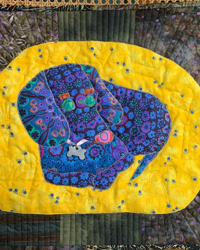 I did some experimenting to capture my dog Penny who passed away this year at 20 human years. I fused an extra layer of batting behind the dog and two extra layers behind her nose to make her poofy. Her blanket is flannel, same as a quilt I made her. I’d normally not mix it with quilt cotton. I stitched Penny’s parts in straight stitch with sparkly gold rayon thread. I quilted some significant shapes into her blanket and quilted the background “radiating” with monofilament which also has a bit of sparkle. The dog tag was hers.