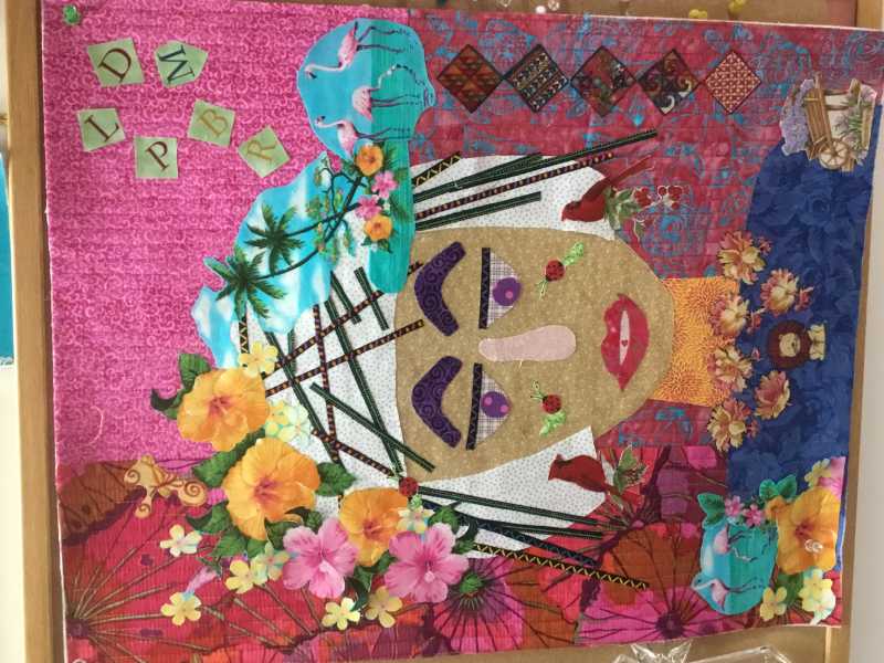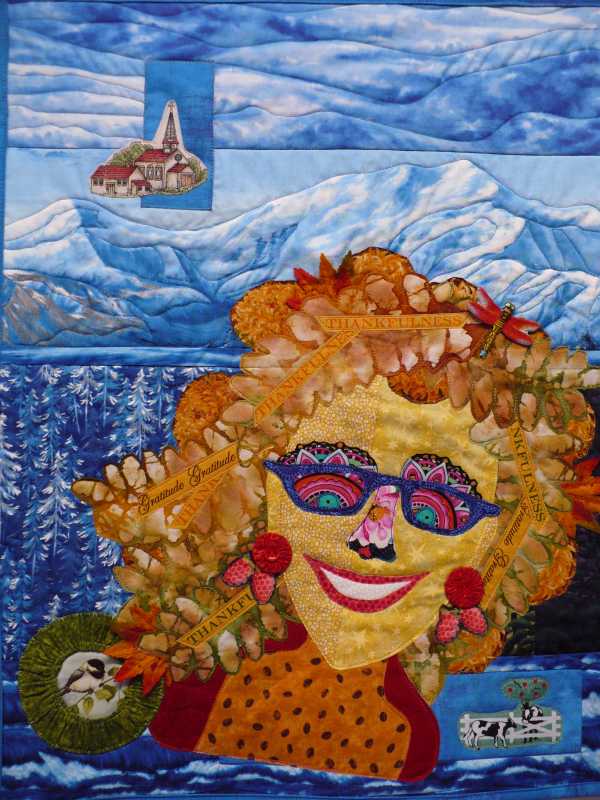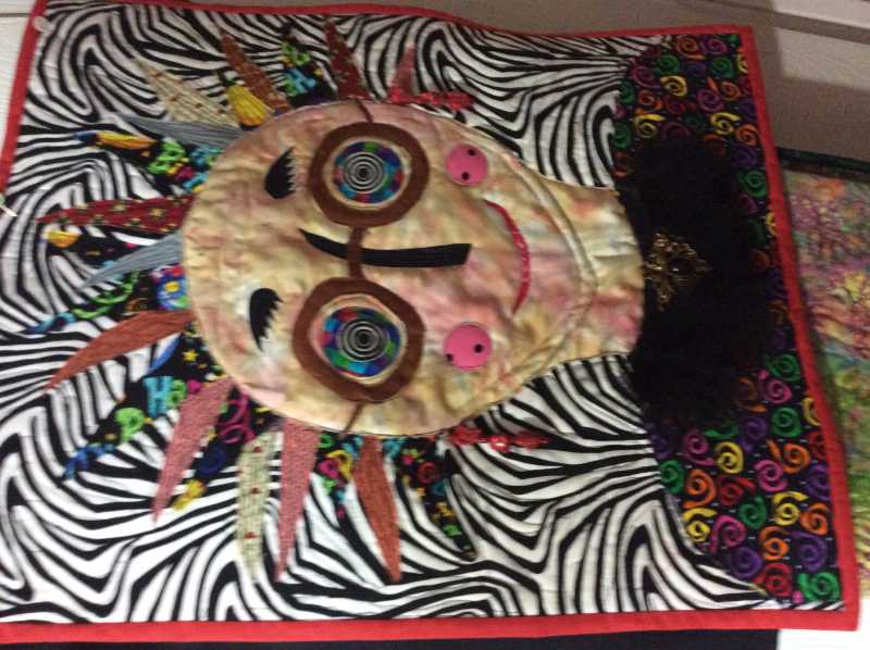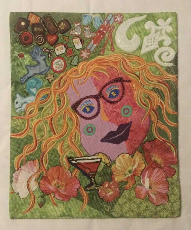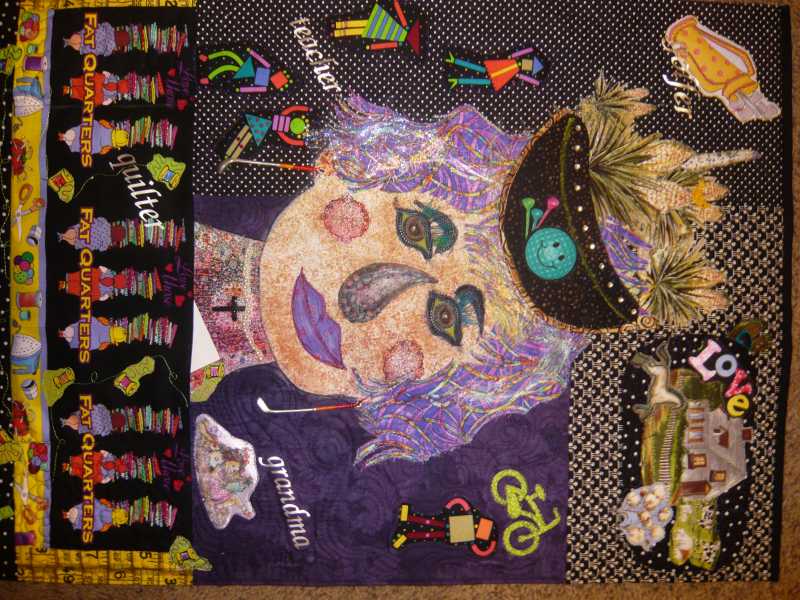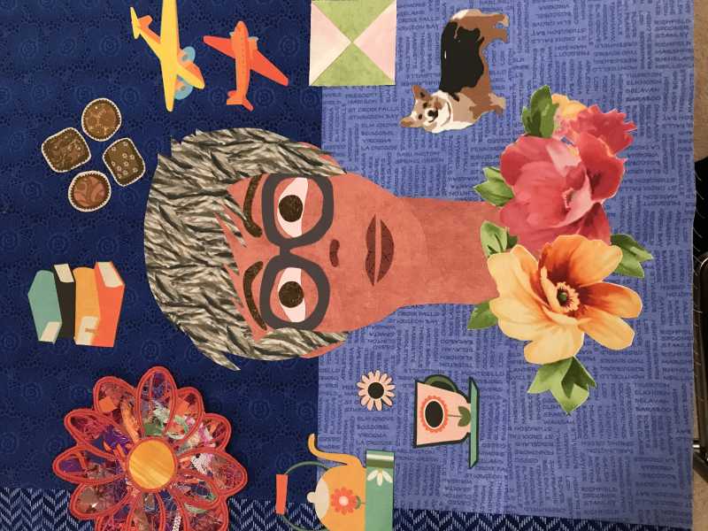 Named JUST BE & tells a story: Grew up on farm, was special ed. teacher ,mother, grandmother. Love being quilter & golfer & Christian. Pocket of momentums in front & story of Covid-19 effects.