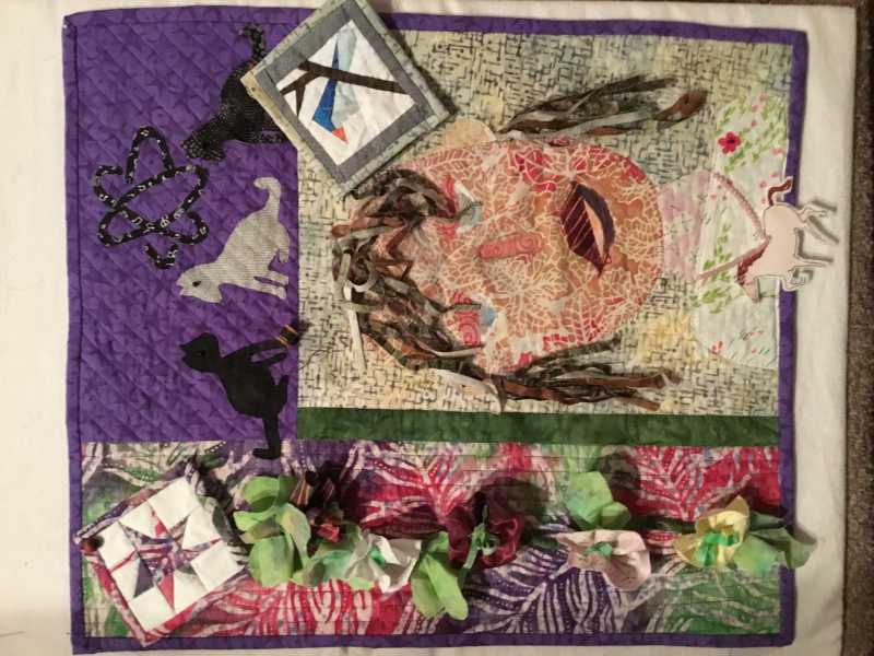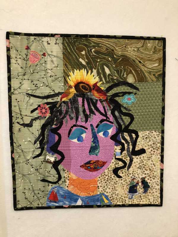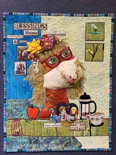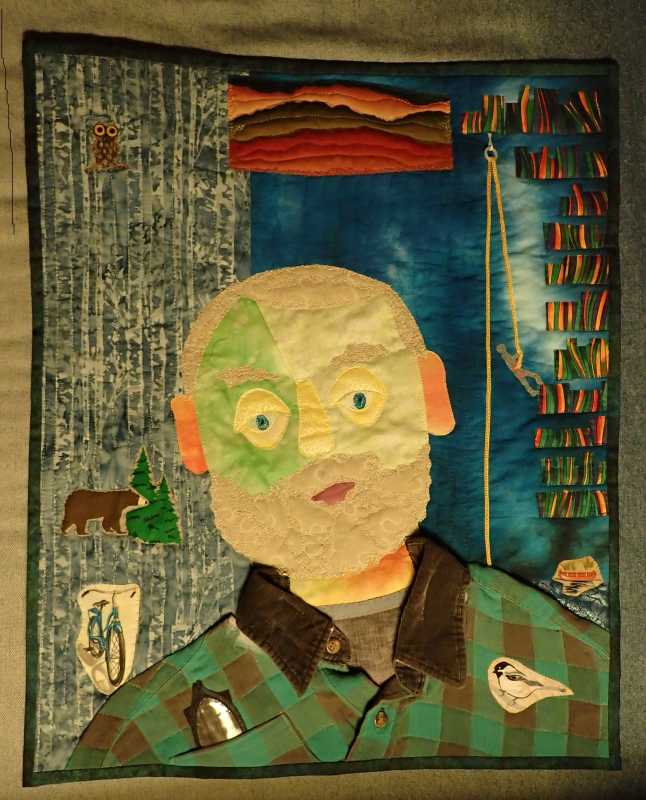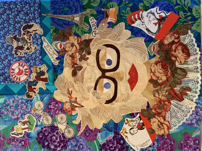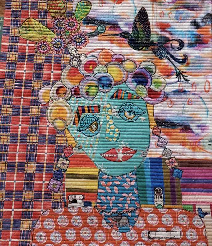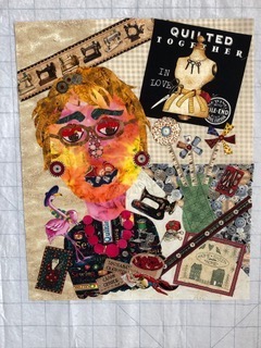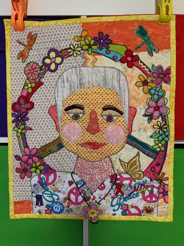 Here is my face, I may add more before I quilt it, I had to clean up my sewing, laundry, guest room! I’m a retired school librarian and kindergarten/first teacher so tried to put lots of characters from books.