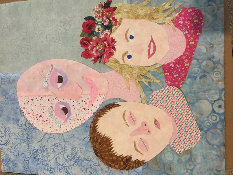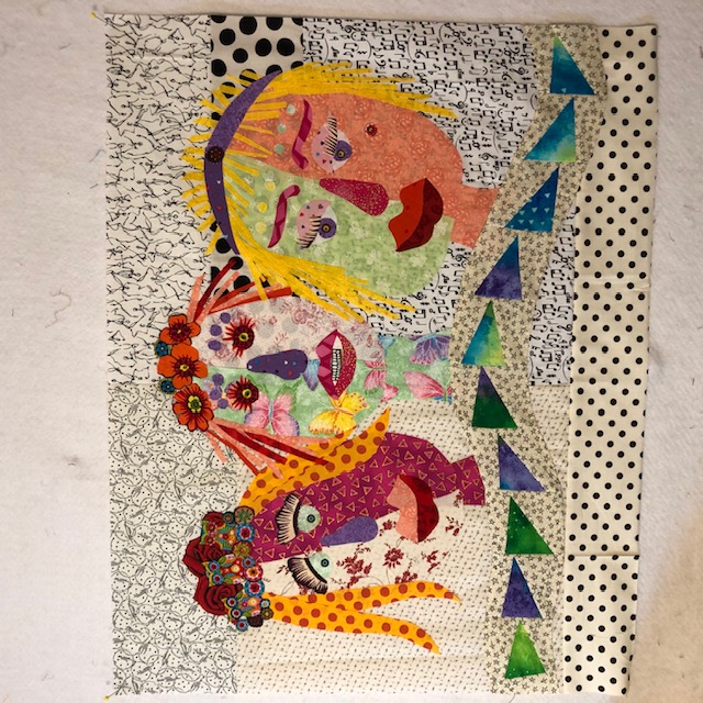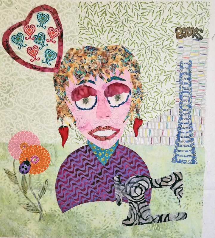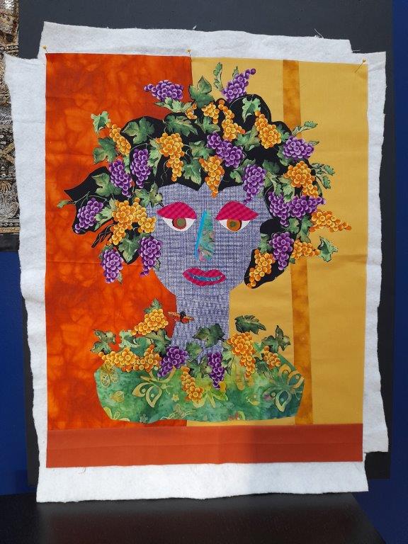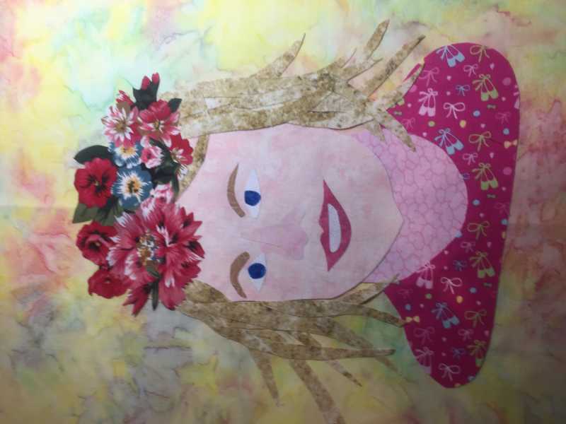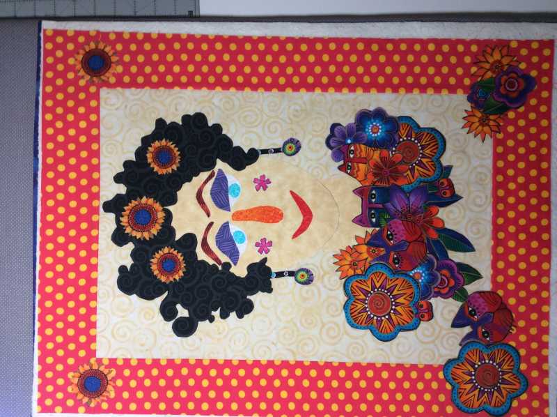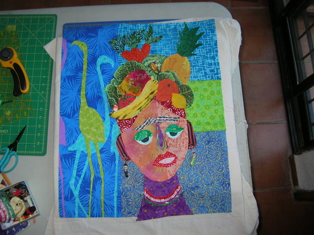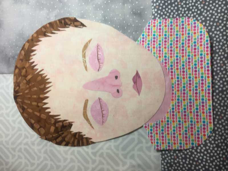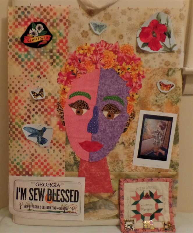 I am through with my face and working on my background. I've included a Row by Row Fabric-Plate from a few years ago from a south Georgia quilt shop with the words "Sew Blessed to be Quilting." That is so true. I've also got my first name