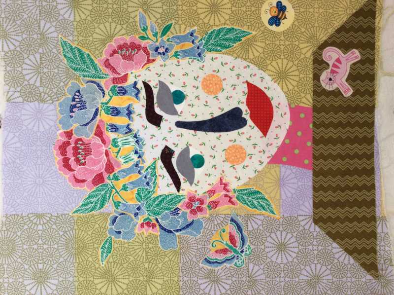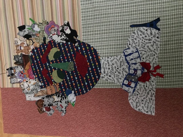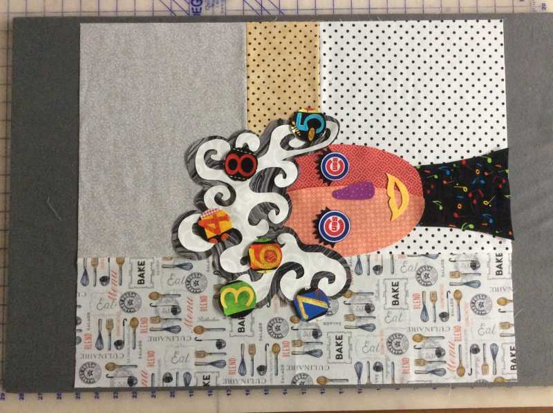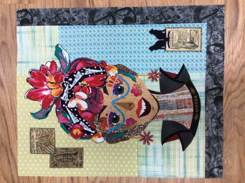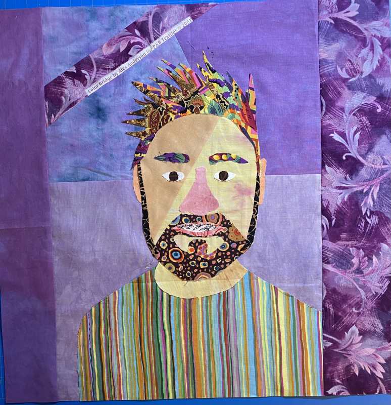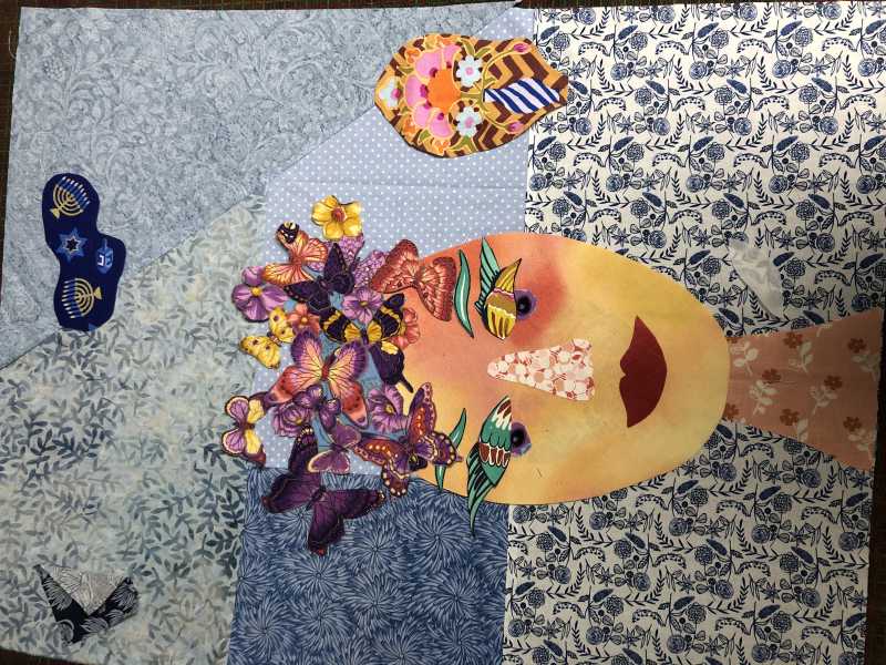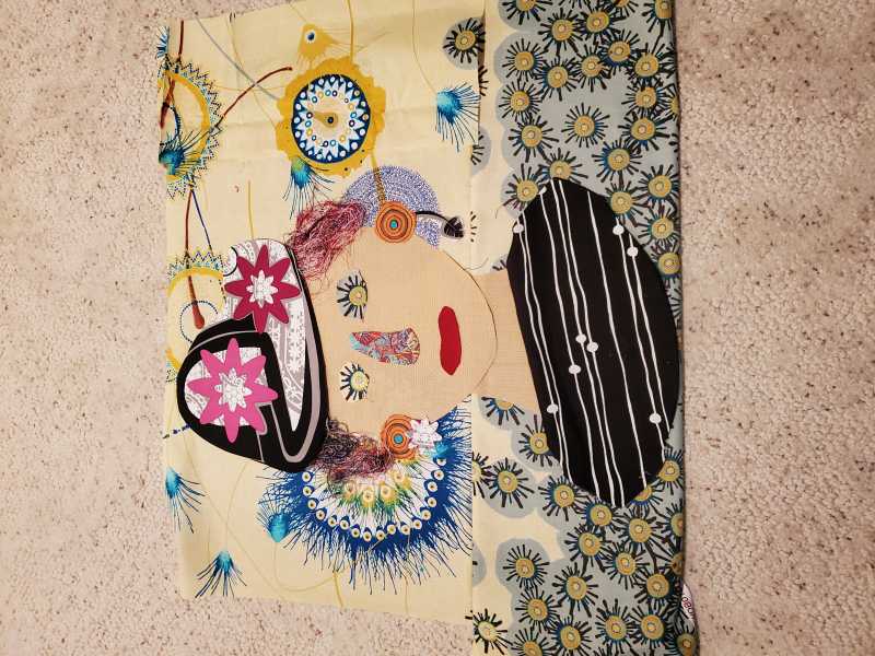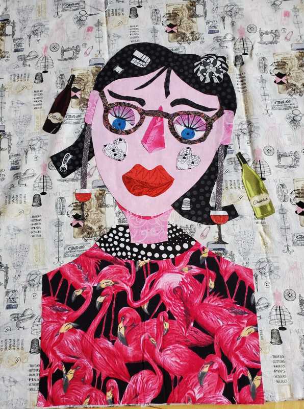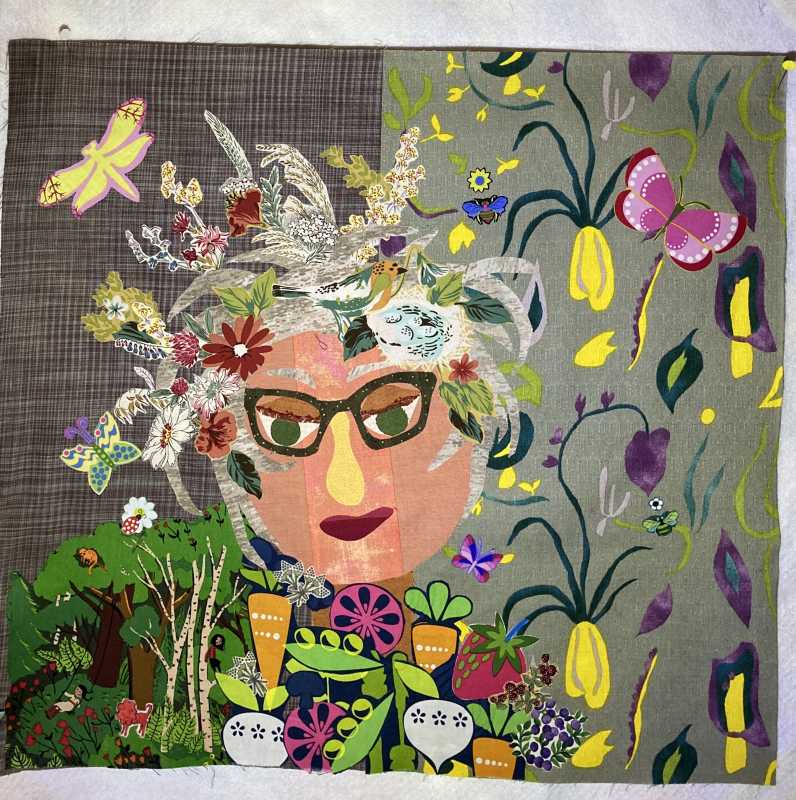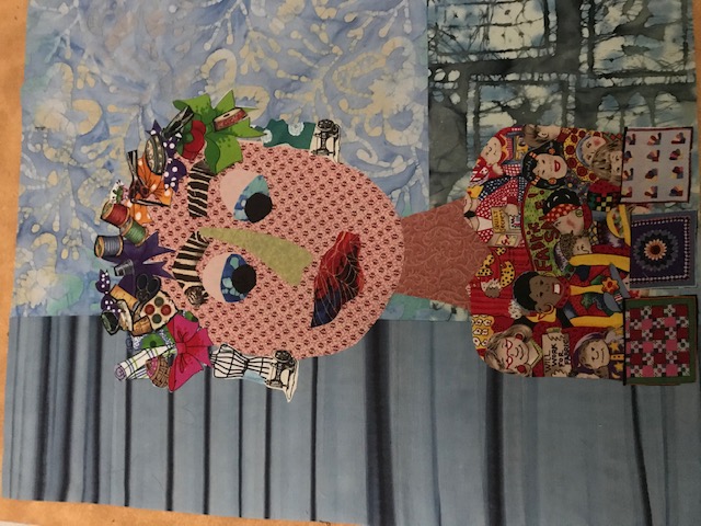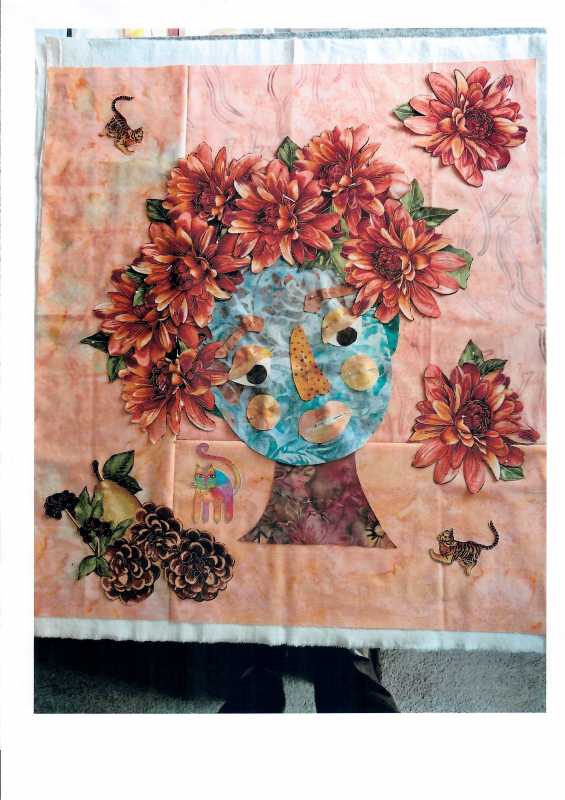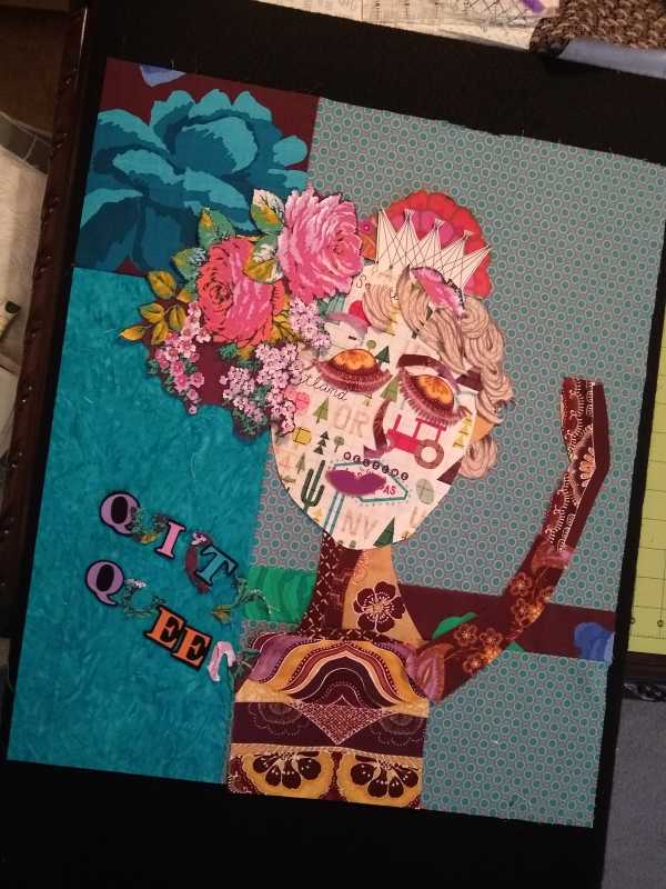 Still working on her. I used a panel to show I'm a Oregon/CA girl, grew up on a farm and love the outdoors. I call her Fantasy Quilty Queen, since I would love
