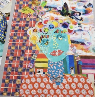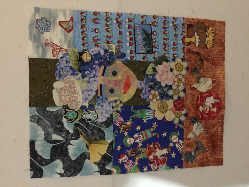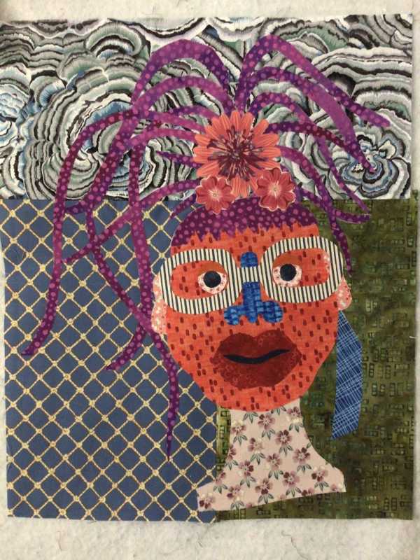 After thinking of so many topics, things of importance, themes for my face, and auditioning various items, I realized I needed to focus and limit what I was trying to say. So after I listened to my quilt, it's message emerged: save a lot of things for a future collection; and indeed, they will be relief projects when I need a break from other things I am working on. I want to do a family of origin face, one for my husband and his Harley, a gardener, an Acorn one (the school I retired from), a nature girl, etc. etc. etc.