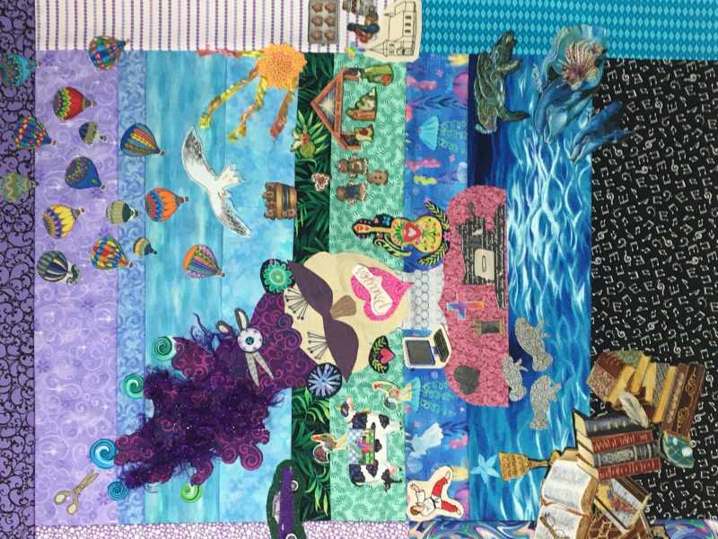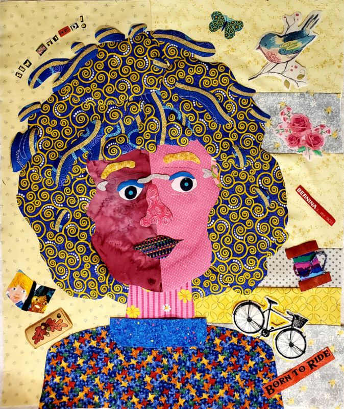 bike, motorcycle rides on the back of the Harley, gardening, feeding the birds, watching the butterflies. Symbols on the figure itself include the garment, which is an old piece from "The Quiltmaker's Gift" fabric line, the subtle roses on the nose (get it?) and of course, the big hair!