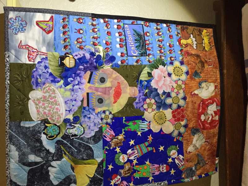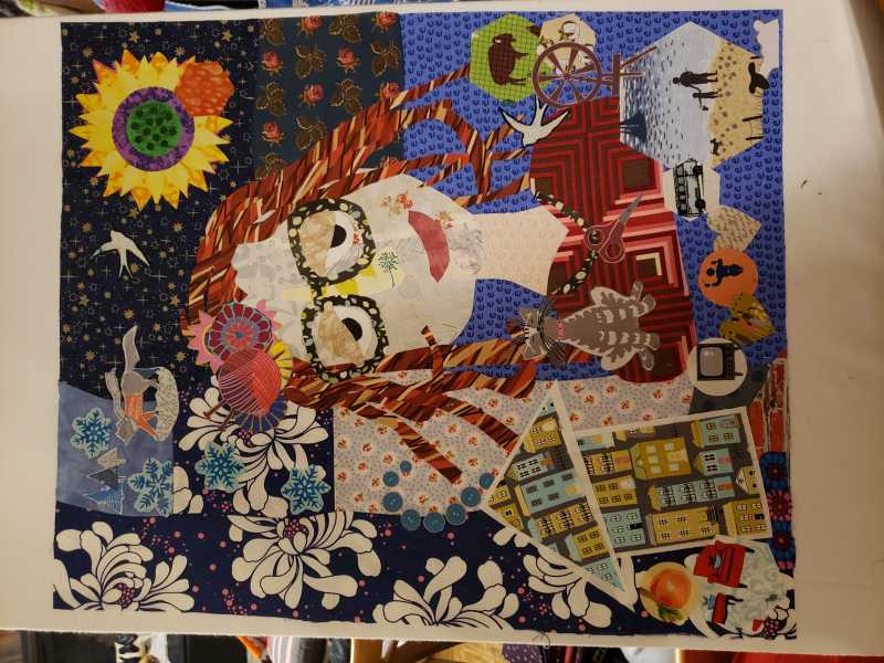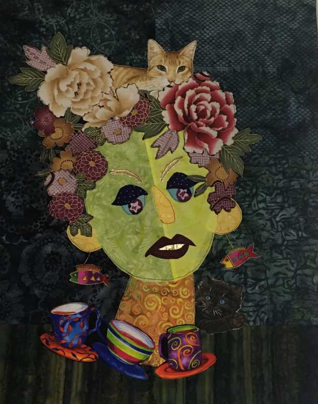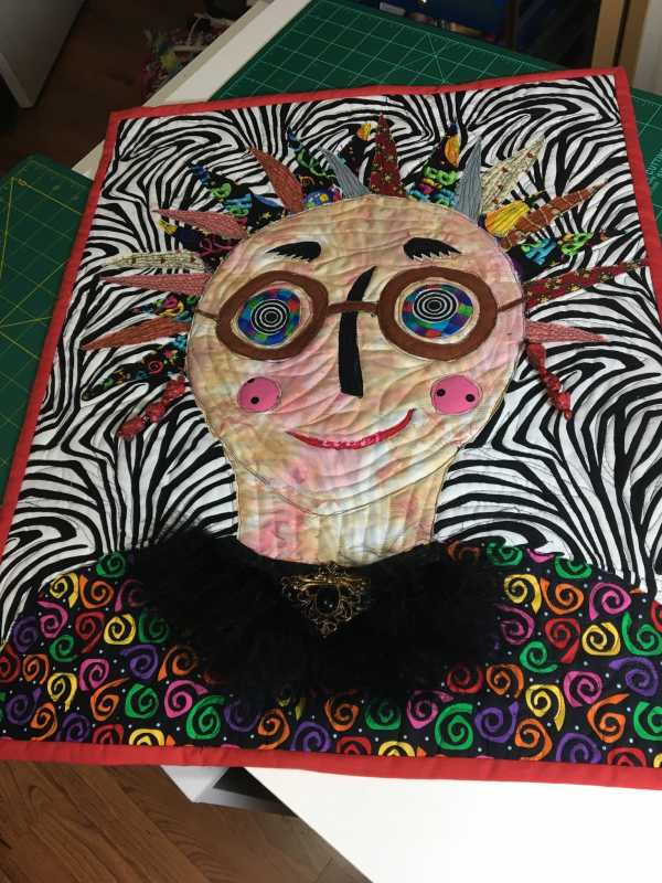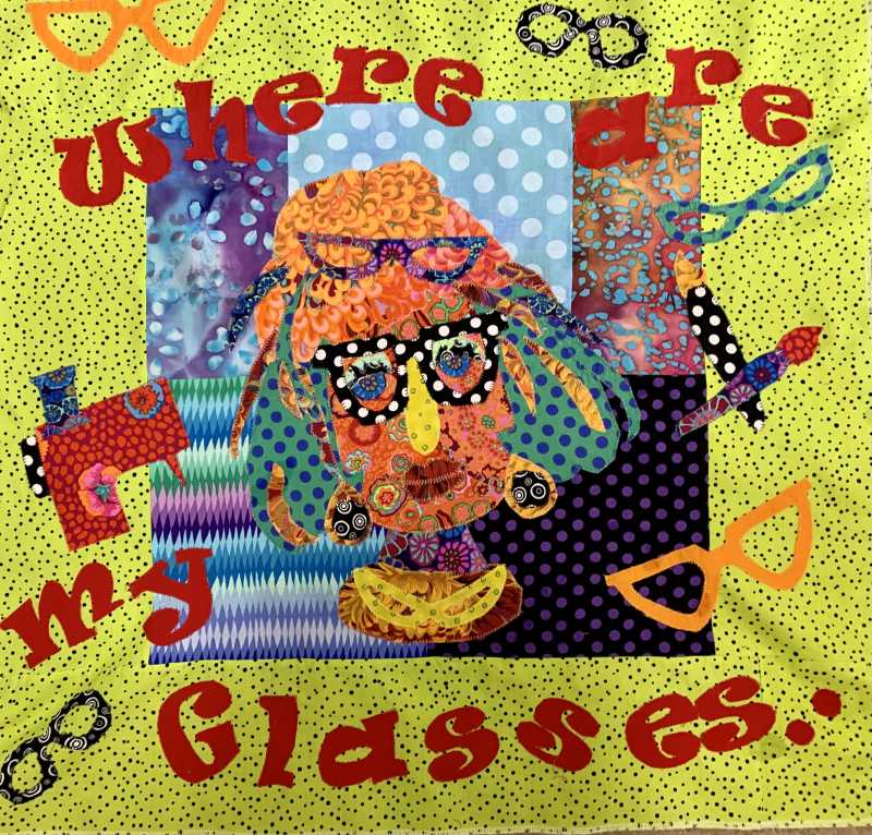 I am a Divide woman there are times when I Can’t decide whether I should be painting drawing or quilting but one thing that always happens is I can’t find my glasses so that is what I added to my portrait