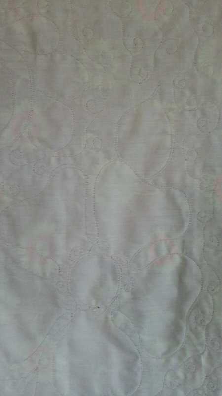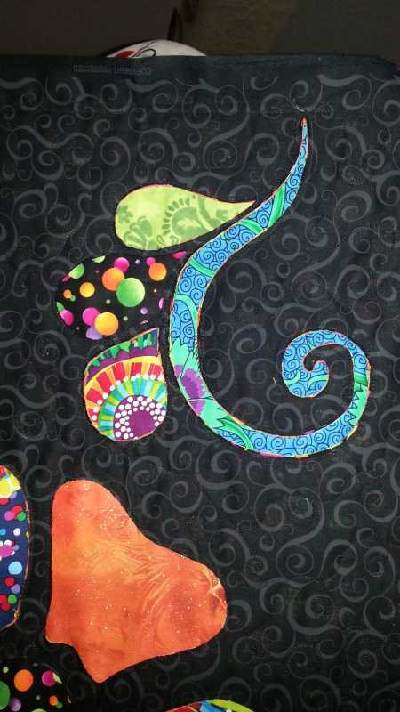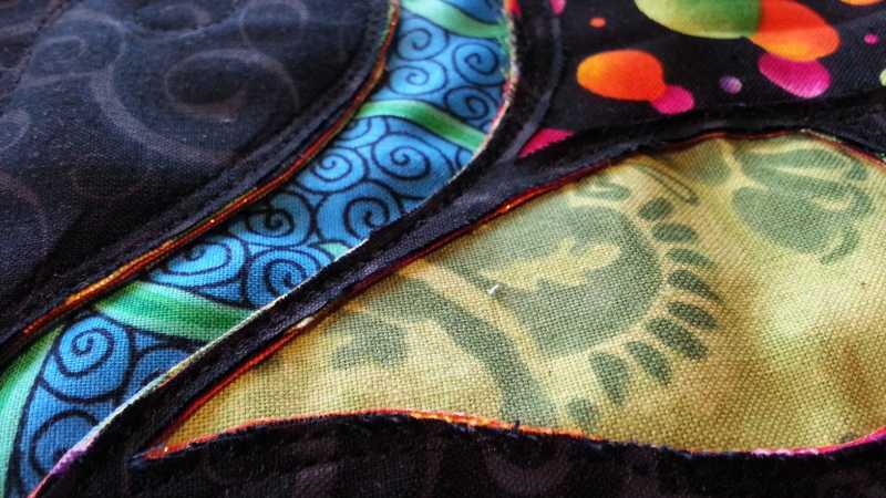 I guess it's about 20" wide by WOF. there's no batting, just a muslin back, 5 layers, then the black on top. I realized later, that I could've left the edges where I cut out a bit longer, then they would've frayed more. or, I could've gone back afterward with a decorative stitch and tacked one layer down and that section would've had a second color framing the color behind it. oh well, guess I have to make another one!