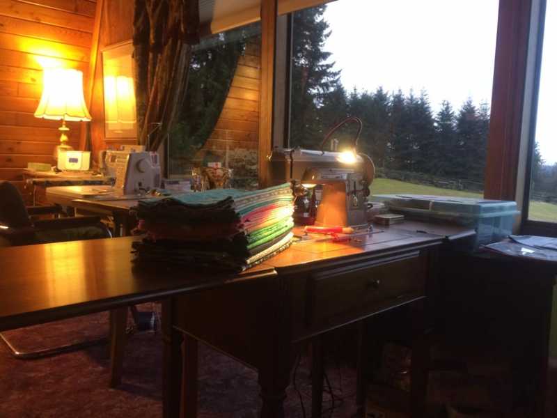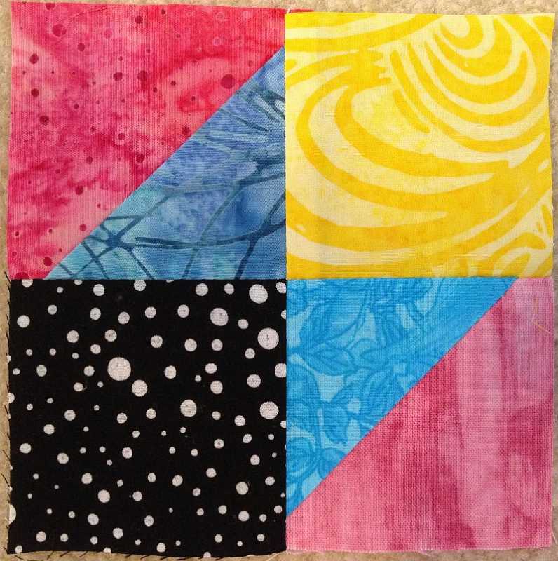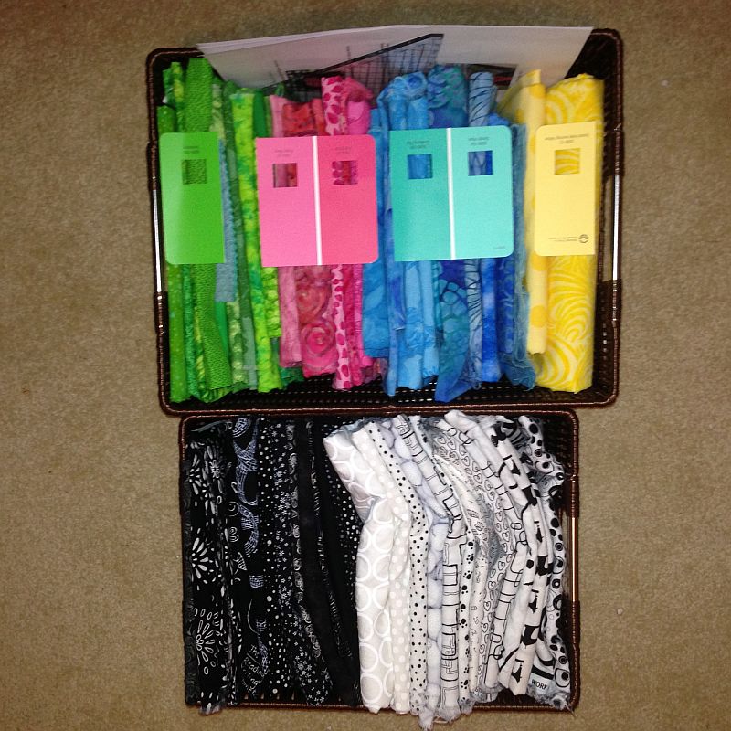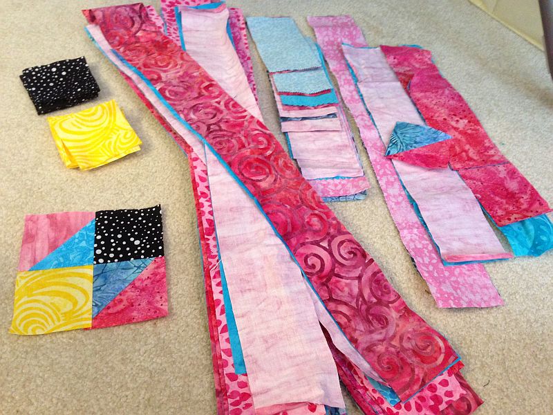 On the fabric colors, I tried to stick pretty close to Bonnie Hunter's suggestions, but her aqua/teal choice of paint chip was more green than the colors I chose, which range more toward blue. I like what I've got, though, so that's all that matters.