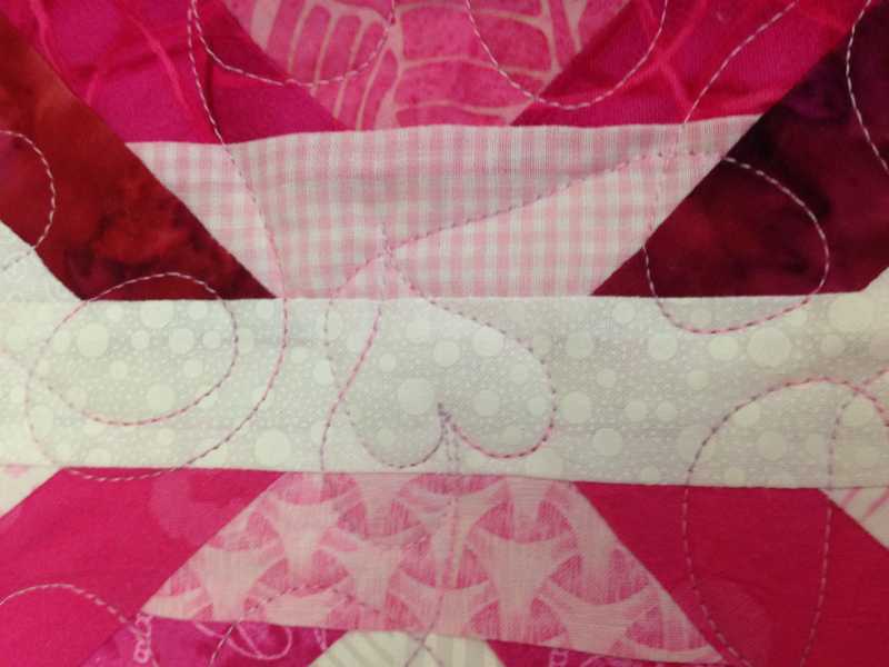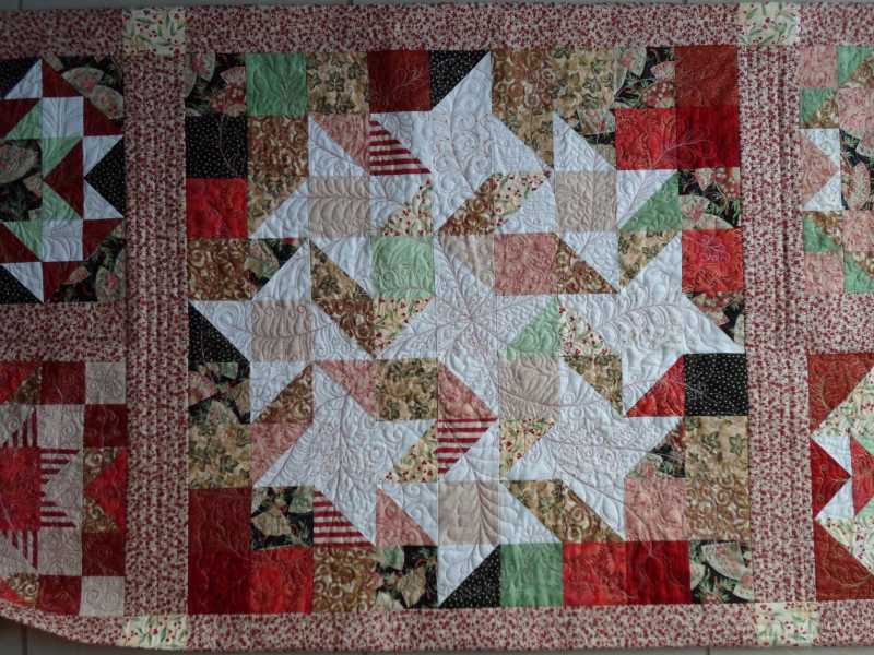 I have FMQ it myself on my Bernina 730 and it is really just a sampler quilt because I just played around with available fabrics, most of which were leftovers from other projects, in the stars and the centre was pieced using a doodled design I did during a meeting. The only fabric that had never been touched before was the one with the fans. The FMQ is also just designs I have been drawing on paper and felt I wanted to try. All the blocks around the centre are quilted with different designs and they are all repeated in the centre "block". This is the first quilt I have ever made where I have felt it all is coming together for me - colours, piecing and quilting.