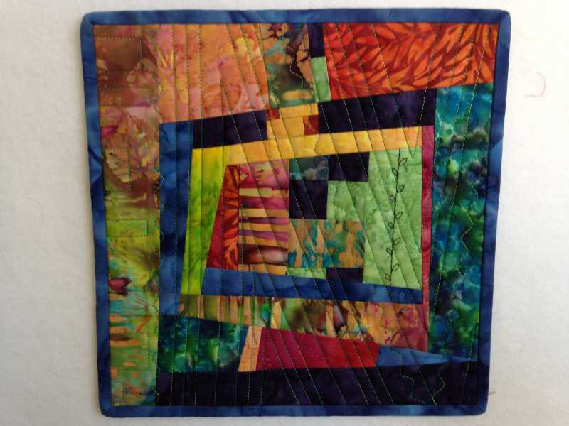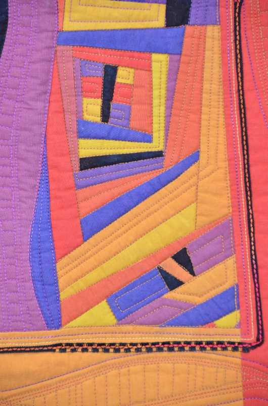 Judy, Rita is correct. I love using my walking foot for quilting. I can do small amounts of FMQ, but prefer using the walking foot. I watched a show here on TQS with Jacquie Gerhing (hope I spelled that right!) and then took a class from her on Craftsy. Basically I just think about where I want the stitching to flow from and to and draw a line with chalk. I only do this if it is a larger quilt. On the muggie I just sewed from top to bottom at an angle. I love using the serpentine stitch on my Bernina. It's so easy and looks nice. I've also started using a wave like stitch also. I used these 2 stitches combined with straight stitching when I quilted the breeze and ocean on the commission quilt. The walking foot has measurements from 1/8" up to 5" inches or so, so I can follow the lines however wide I want it to be. On this muggie I had fun with a straight stitch on the side making squares and rectangles by going off the end of the muggie. I have done so much walking foot quilting that I can quilt most anything, even curves. I've learned to be able to start and stop on a stitch to make corners crisp. Here is a close up of "The Doors" (which will be hanging in the local quilt show this weekend!). All of this quilting was done with a walking foot.