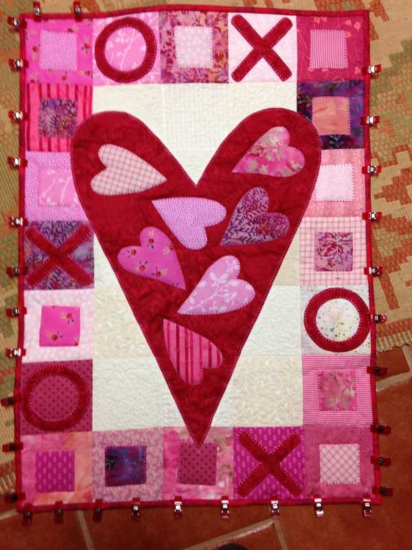 The next goal for the FHC quilt was to blow it up from 3"x6" to 3'x6' which is the size of the quilt top without boarders. If I got that done without messing around then I had my own permission to work on a UFO valentine wall hanging that's been try to get done for the past 2 valentines days. Long story short I completed a master copy of the design early last week. (Easier said than done I might add.) Thursday I finished the Valentine wall hanging and it's hanging in my DMIL's room in her nursing home. Here it is almost done. Forgot to take a finished pict.