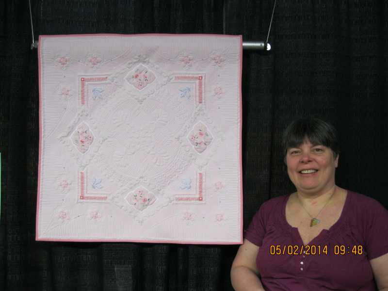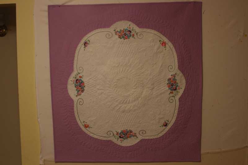 Barb, as I recall they are in small wall hanging category. Mine is embroidery with a white linen in a circle shape on purple background, but the quilt is square. Nancy's is pink and very delicate and pretty. Thanks so much for pictures. Greatly appreciated. I will post a pic for you to see.