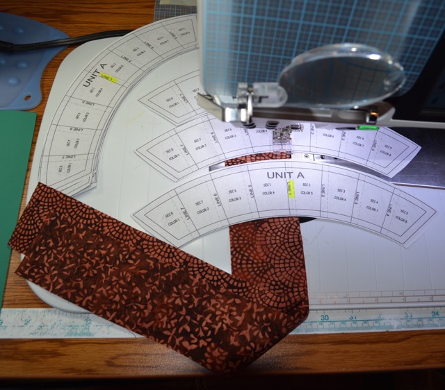 This picture shows the foundation strips after a few strips have been sewn and trimmed. The next strip has just been sewn down, waiting to be pressed and rotary cut apart.