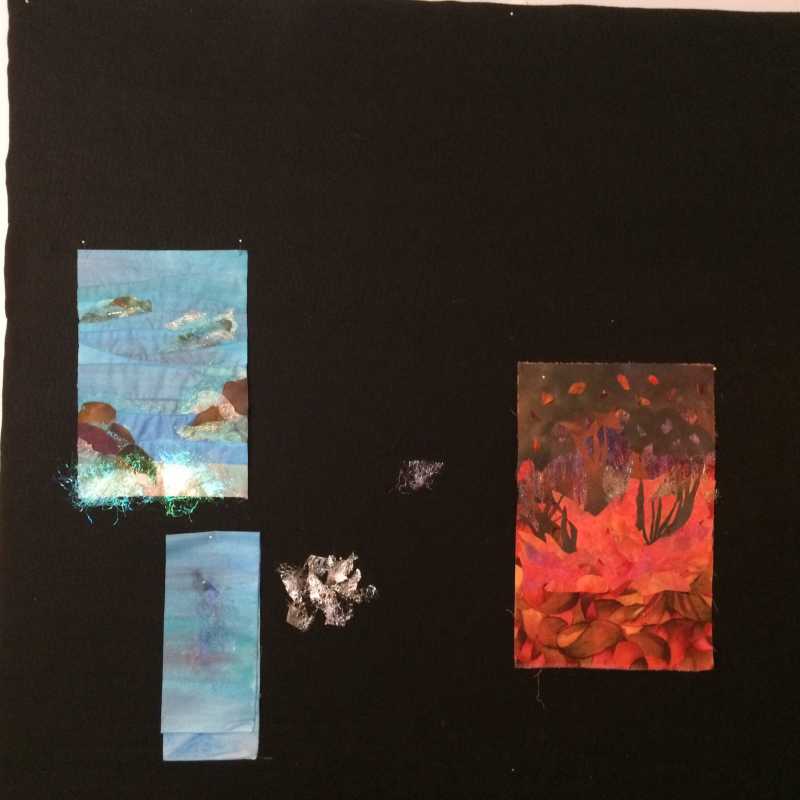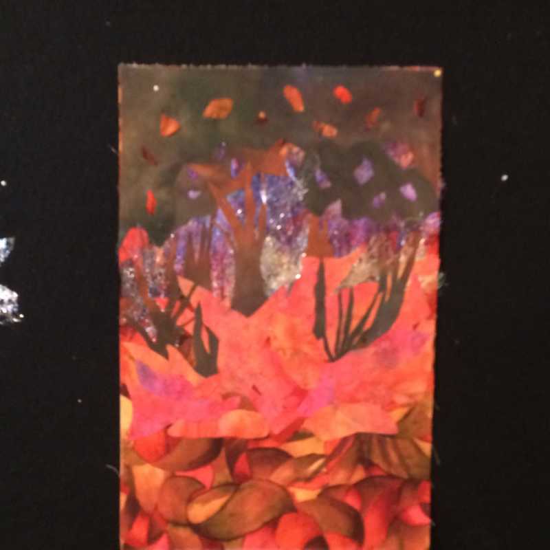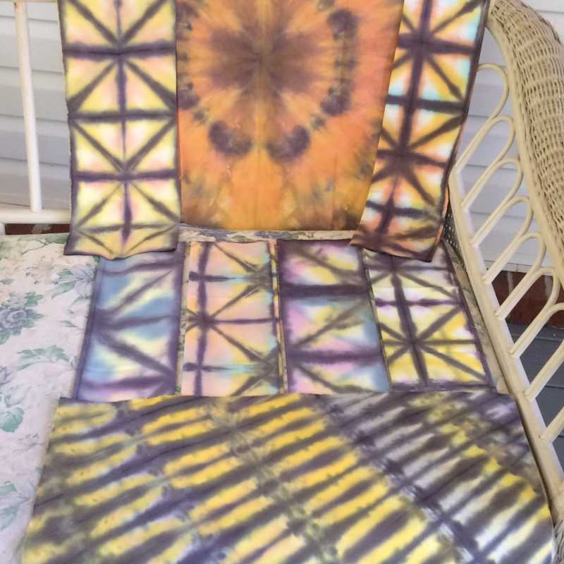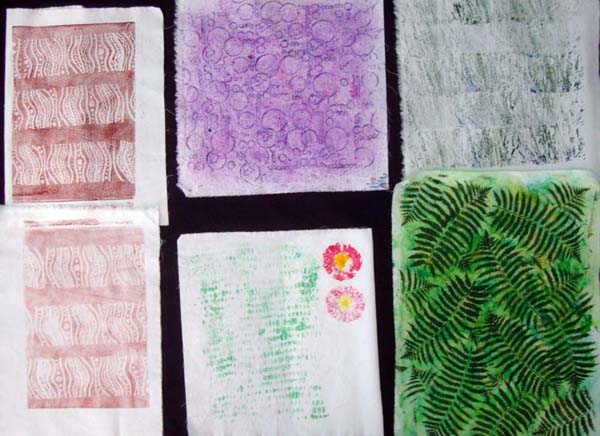Upper right is a monoprint - I brayered paint on a rubber printing plate then removed some of the paint with a rubber stamp, then placed fabric on the paint and gently rubbed. The fabric below that one is the second printing since there was still some paint left on the rubber plate. Middle top - paint was first splattered onto fabric using a tooth brush flicked with my thumb, when that was dry I placed a rubber stamp under the fabric and rubbed the fabric with a solid paint stick, much like people take rubbings of gravestones. Upper right, scrunched and pleated Saran plastic wrap around some cardboard, dabbed it in some paint and stamped it on the fabric. The vertical lines work well as a grass image, but the overall pattern is nice, too. Lower middle - brushed paint on a corn cob and rolled on the fabric; then I cut the corn and dabbed yellow paint in the middle and pink paint on the kernels to produce a flower image. Lower right - first layer was paint sponged on the fabric, then when that was dry, I stenciled the fern image on top.