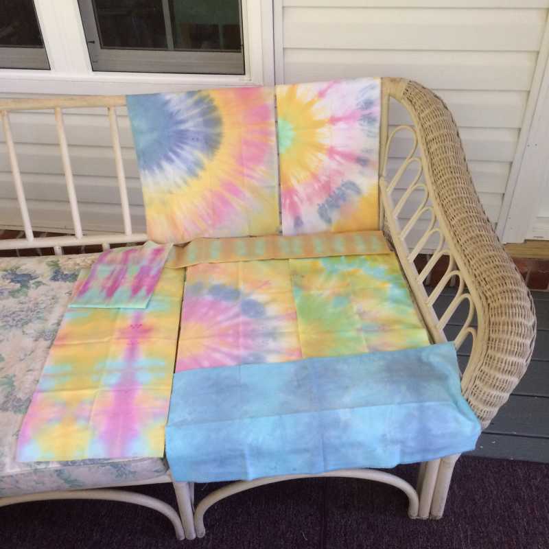 For this one I scrunched up the fabric and using a very wet sponge dabbed the paint all over. If I had added more water, the paint would have soaked through and distributed more evenly, but this is a nice effect as well.