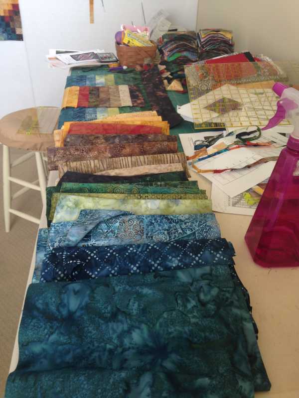 And here's a picture of my work table. Those are all the fabrics I used as well as the left over stratas. I suspect they will end up in the quilt somehow. (Plus the wips that are waiting to be decided on.
