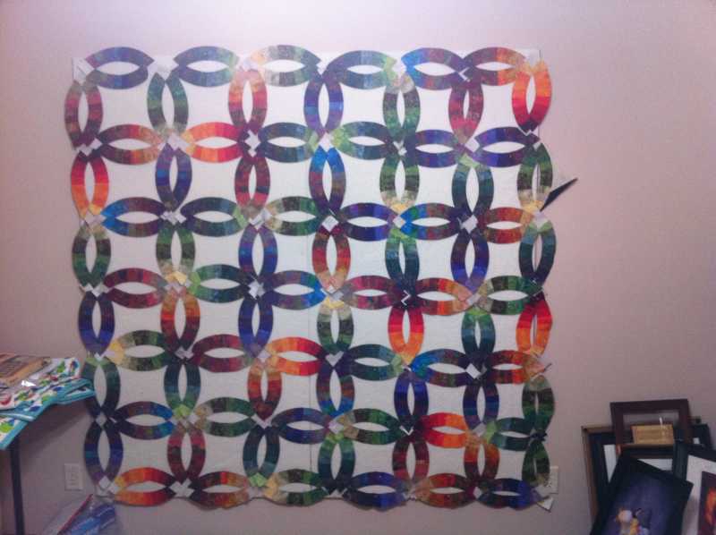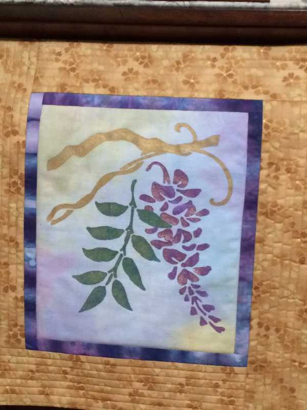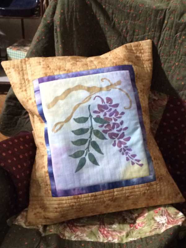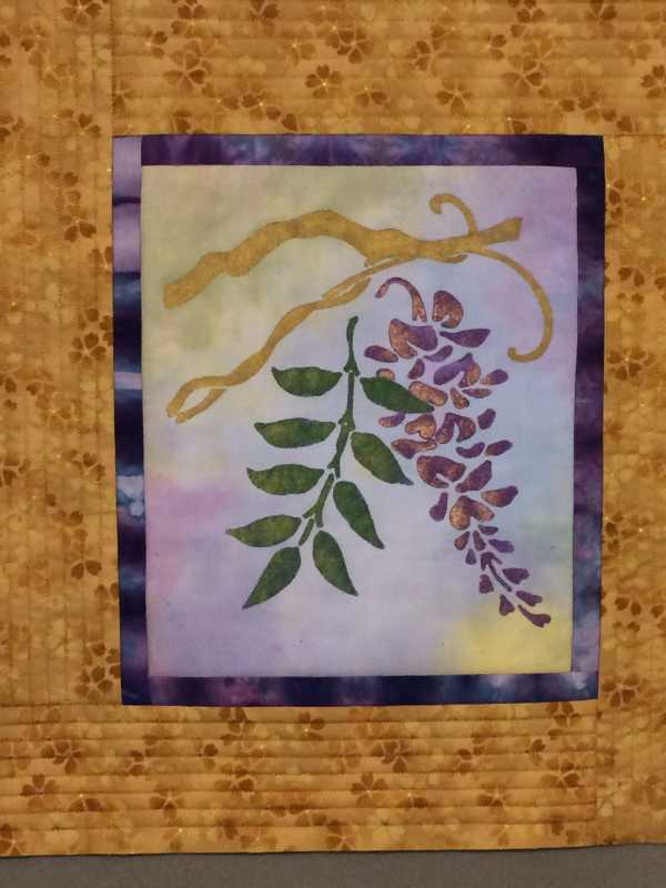I spent enough time in my sewing room, over two hours, and got the quilting done on my Wisteria piece.
